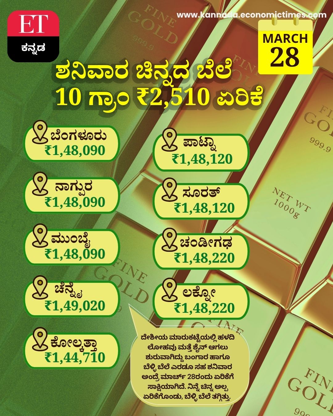 Examining gold prices across the country on Saturday, March 28: the price of 24-carat gold per gram rose by Rs. 251 and is trading at Rs. 14,809. Meanwhile, the price of 22-carat gold per gram...