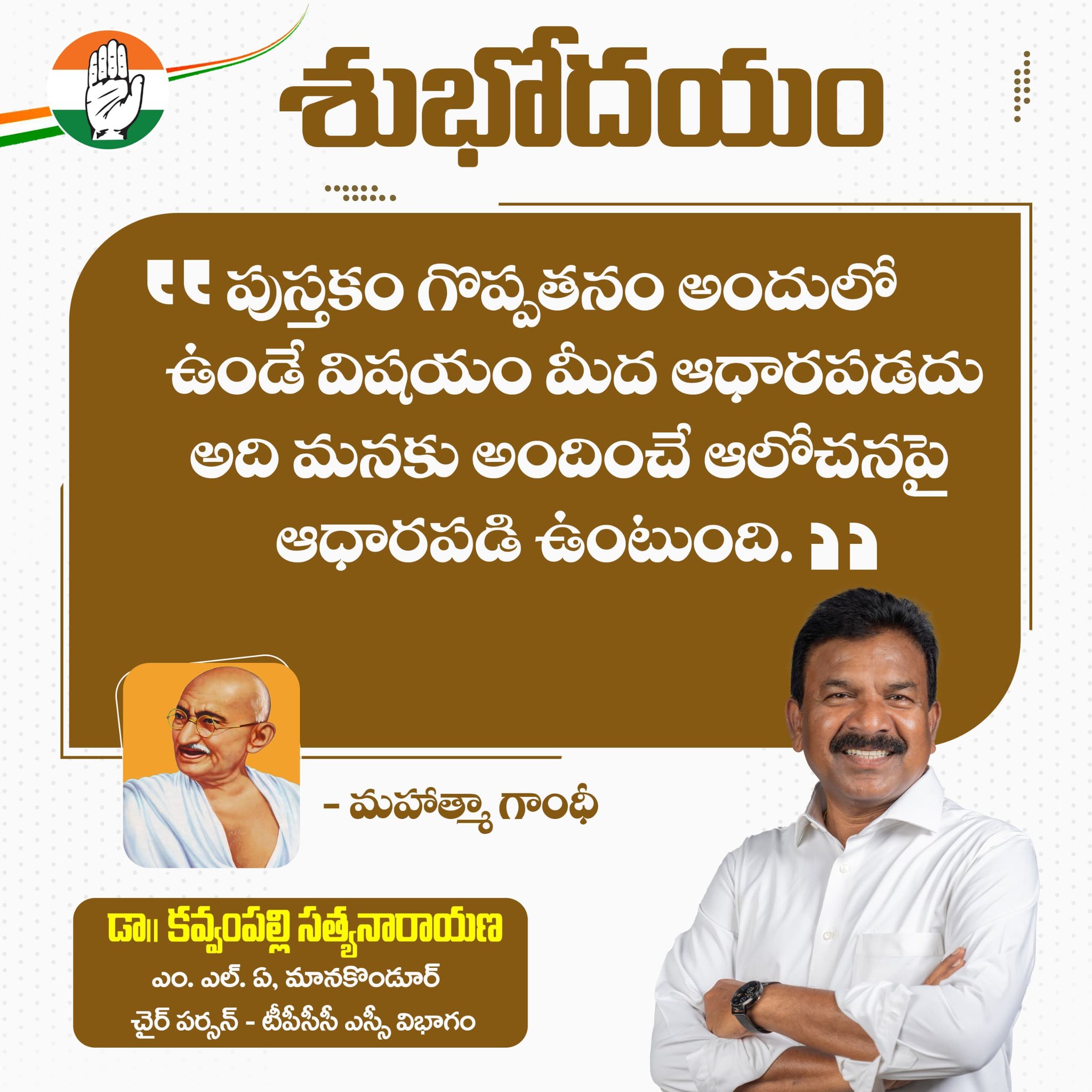 Dr Kavvampally Satyanarayana @DrKavvampally · 7h శుభోదయం: " పుస్తకం గొప్పతనం అందులో ఉండే విషయం మీద ఆధారపడదు అది మనకు అందించే ఆలోచనపై ఆధారపడి ఉంటుంది." _ మహాత్మా గాంధీ #GoodMorning #Goodvibes 30