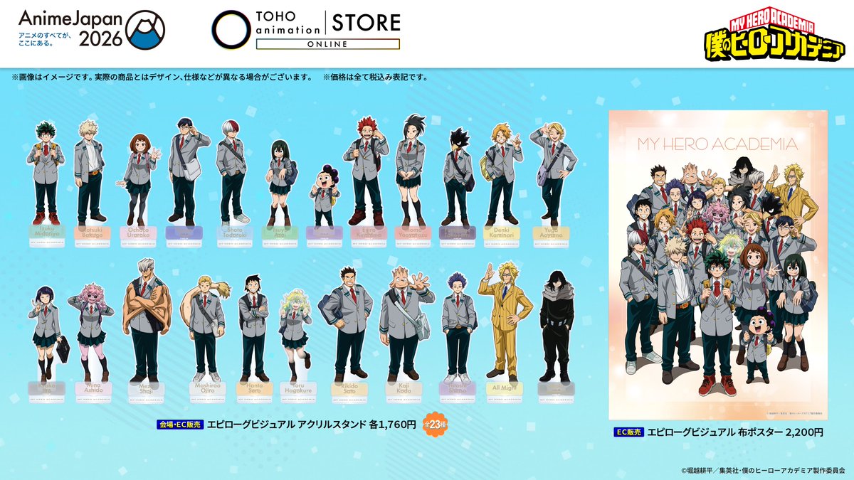 僕のヒーローアカデミア/ヒロアカ アニメ公式 @heroaca_anime · 1d ◤ #ヒロアカ in #AnimeJapan2026 TOHO animation STORE グッズ情報 ◢ エピローグビジュアルを使用した新規グッズを TOHO animation STORE ONLINEブースにて販売!! ECサイトでは3月30日(月)23:59まで 売切れナシの受注販売を実施中!! お見逃しなく!! ▶tohoentertainmentonline.com/shop/pages/aj2… #heoraca_a 2 304 2.7K 87.8K