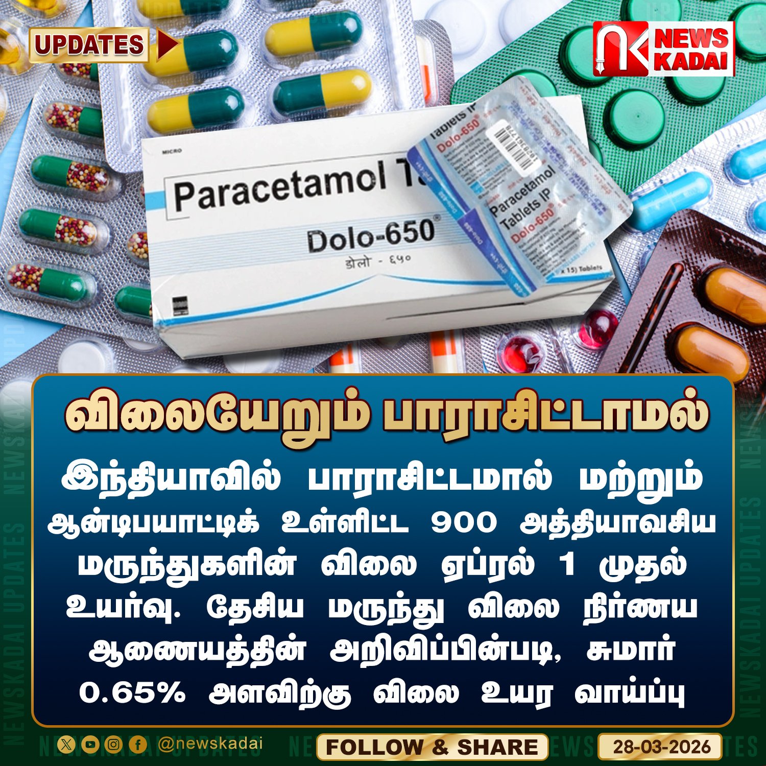 News Kadai @newskadai · 9h விலையேறும் 📷📷பாராசிட்டாமல்.. இந்தியாவில் பாராசிட்டமால் மற்றும் ஆன்டிபயாட்டிக் உள்ளிட்ட 900 அத்தியாவசிய மருந்துகளின் விலை ஏப்ரல் 1 முதல் உயர்வு. #tablet #paracetamol #hike #hospital #medicine #newskadai #trandinmH 8