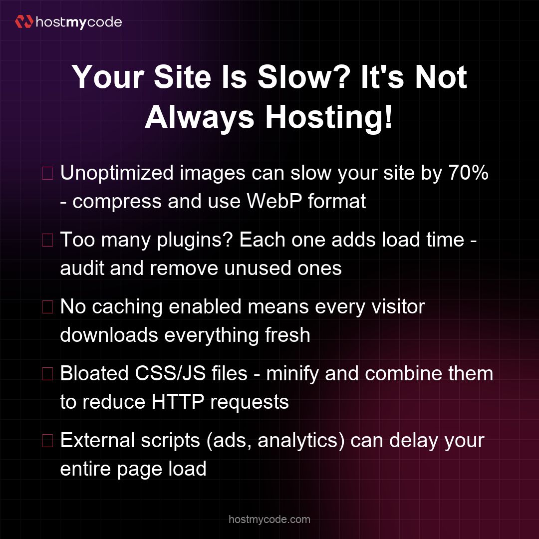 Before blaming your hosting provider, check these common speed killers! 🚀 Even premium hosting can't fix poor optimization. Start with image compression and watch your load times drop instantly! #HostMyCode #WebPerformance #WebsiteSpeedi