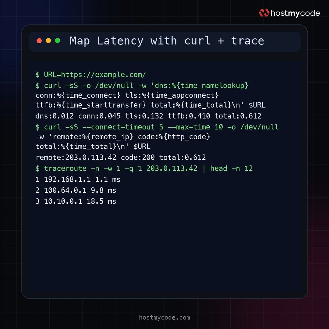 Slow page loads? Split the problem: curl shows where time is spent (DNS/connect/TLS/TTFB), then traceroute/mtr highlights the hop that spikes. Run it from your server and from your local network to compare. #HostMyCode#webhosting#curl#traceroute#mtr#latency#devops