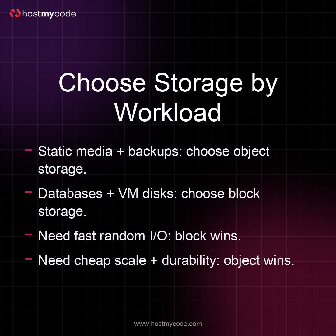 Not sure which storage to use for your app? Match it to the workload: object for scalable files, block for low-latency disks. Build smarter hosting stacks with #HostMyCode. #WebHosting#CloudStorage#DevOps