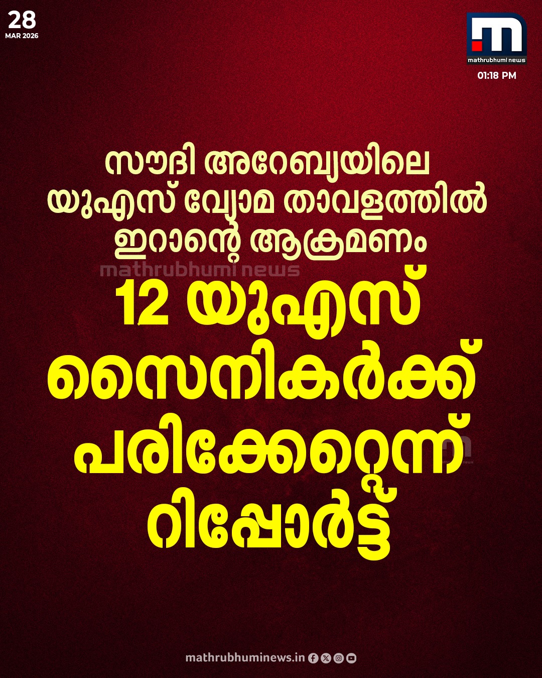 സൗദി അറേബ്യയിലെ യുഎസ് വ്യോമ താവളത്തിൽ ഇറാന്റെ ആക്രമണം;12 യുഎസ് സൈനികർക്ക് പരിക്കേറ്റെന്ന് റിപ്പോർട്ട്