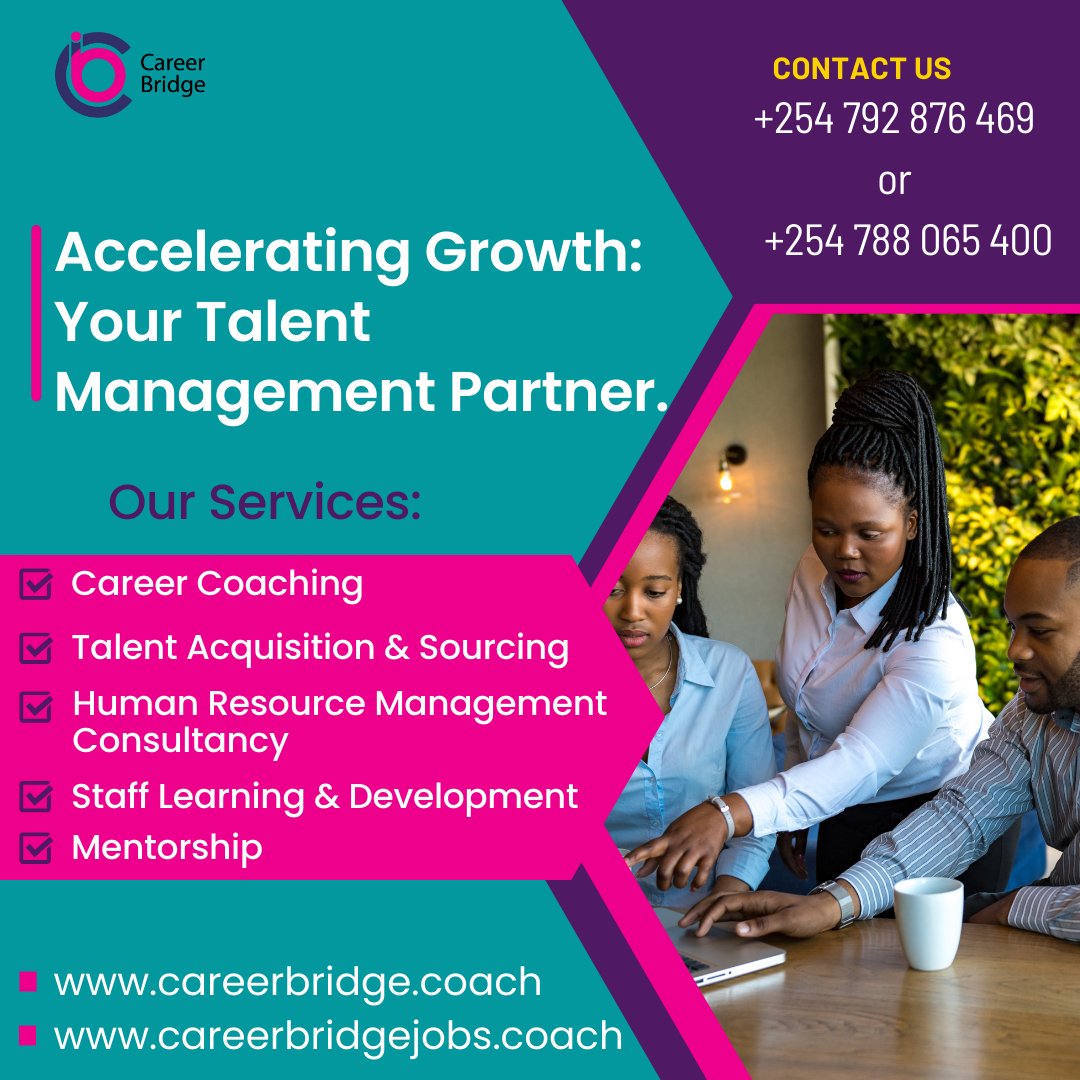 At Career Bridge, we accelerate growth of people and organizations through talent management. Connect with us! Call +254 792 876 469or +254 788 065 400. #TalentAcquisition #Mentorship #LearningandDevelopmen #marriage #postmedicalinterns