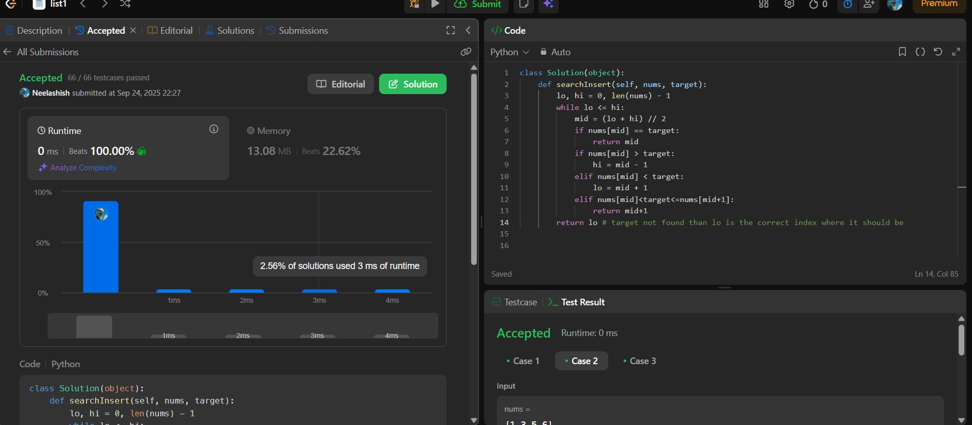 Just solved the 'Search Insert Position' problem! 🧠💻 Binary search makes finding the correct index super fast O(log n) efficiency feels amazing! #100DaysOfCode #LeetCoYa