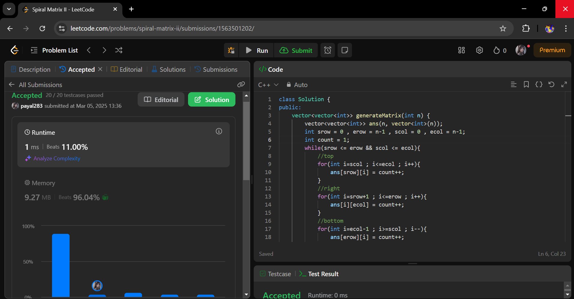 'Spiral Matrix II' on LeetCode done! 🌀🥳 Really enjoyed visualizing that spiral. A big takeaway was the importance of nailing boundary conditions. Small details make a huge difference! Feels good to solve it.😊 #DSA #coding #leetc@od