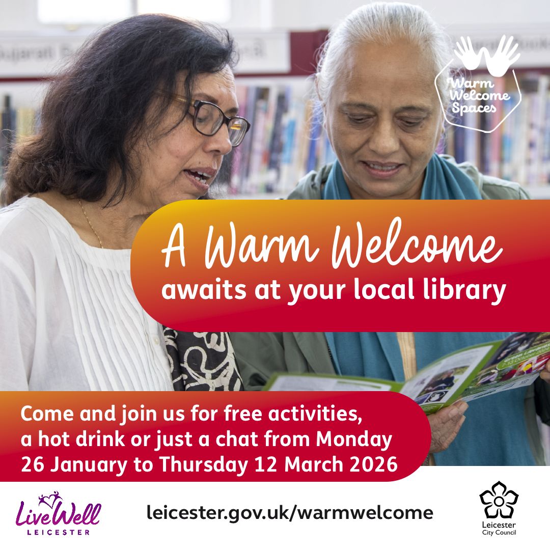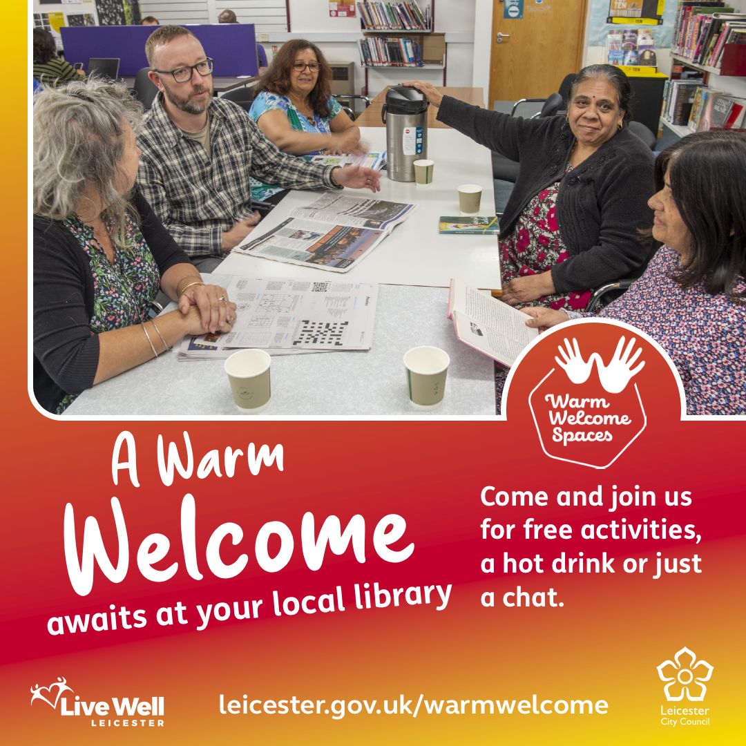 Live Well Leicester @LiveWellLeics · Nov 21, 2025 The city’s Warm Welcome spaces in local libraries offer everyone a friendly space to keep warm, connect and make new friends. To find your nearest Warm Welcome library go to: leicester.gov.uk/warmwelcome warmwelcomespace #communitywellbeing #letsgettogether #stayconnected 1 64