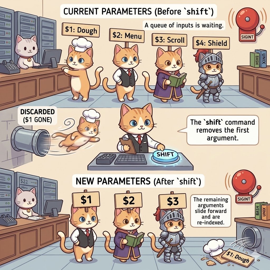 Before shift: $1=Dough 👨🍳 After shift: $1=Menu 🍽️ The first parameter is discarded, and the rest slide forward and re-index. Easy! 🐱💻 #bash #linux #programming #tutoib2dT