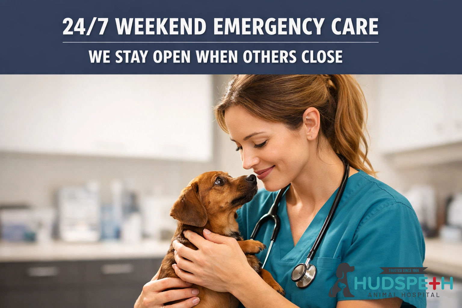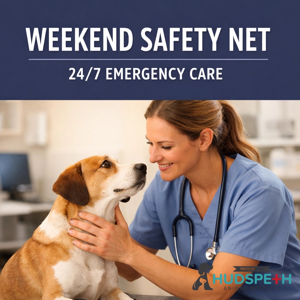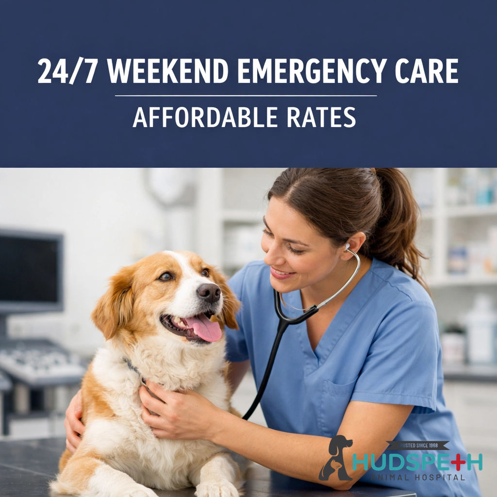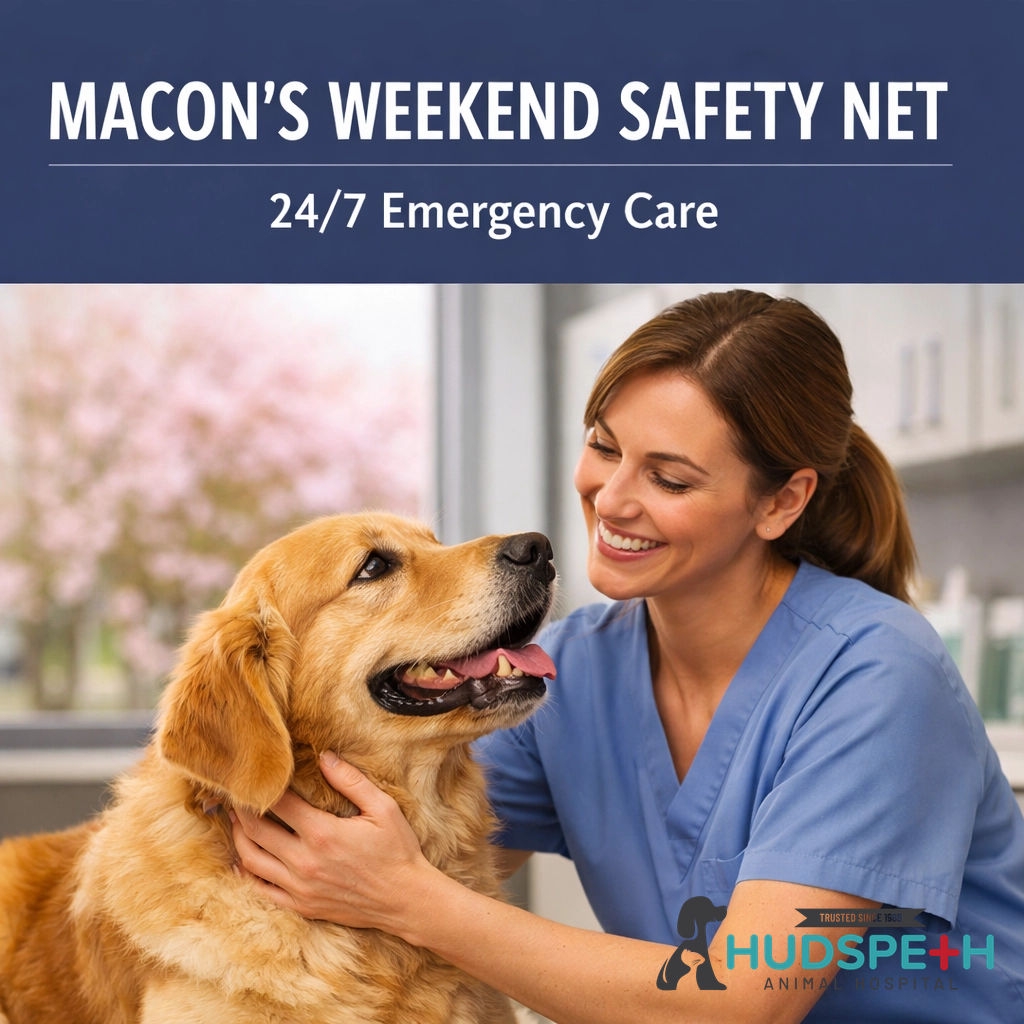 Macon’s Weekend Safety Net is here! 🐾 Spring hazards cause emergencies. Hudspeth is open 24/7 on weekends. No appointment needed. Save 25-40% vs corporate.