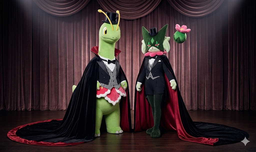 ChaoEmperor Productions LLC @ChaoemperorC · 6d Meganium: How can you not underestimate the true beauty of a caped masquerade mascot hero? Meowscarada: Whatever the reason, we'll bring justice to all of the land. #mascot #mascotcostume #pokemon #cosplay #cape #tophat #tuxedo #meganium #meowscarada 44