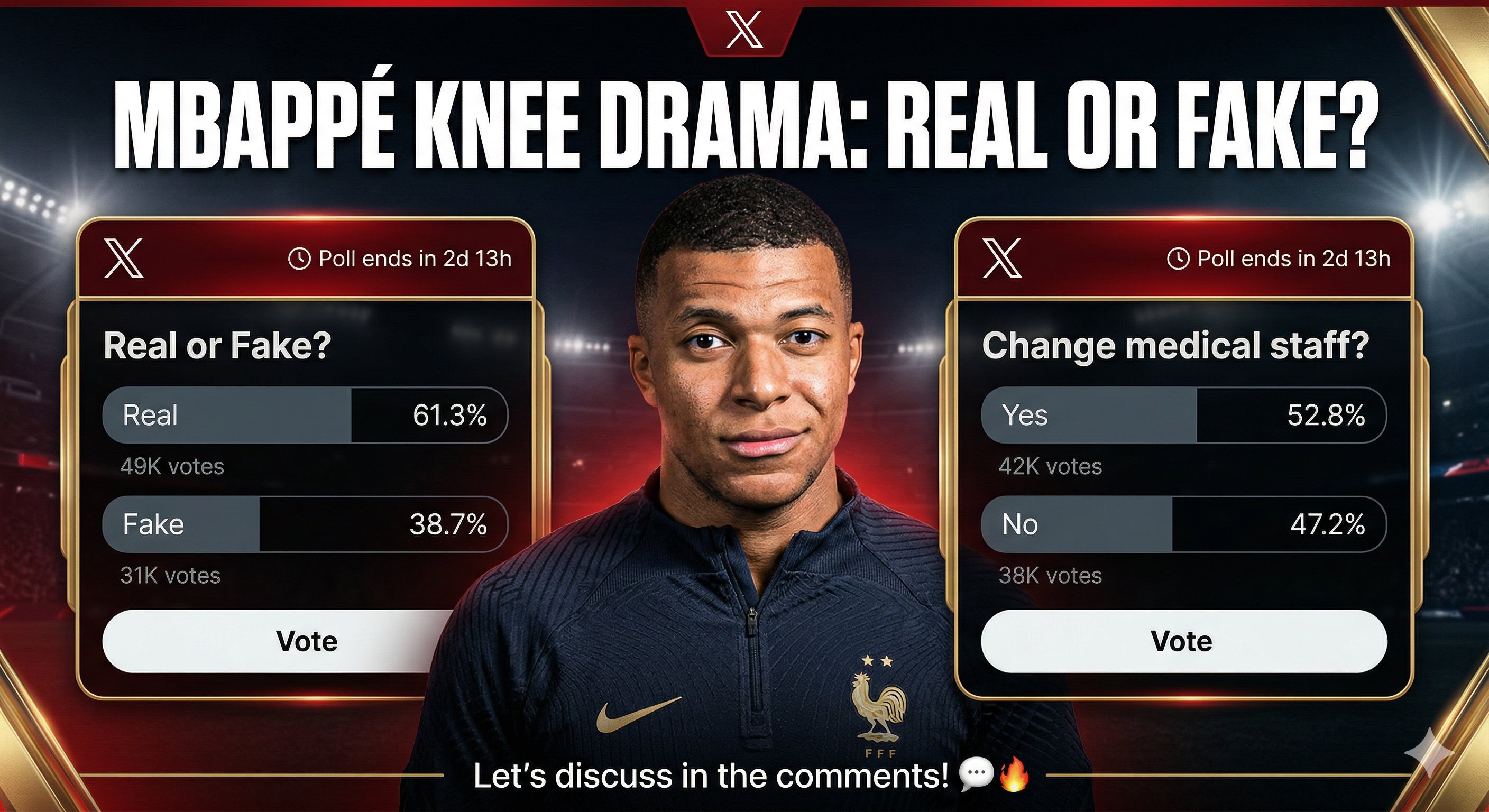 The Mbappé Knee Disaster: Truth or Fiction? 🧐 Should Real Madrid fire their medical staff? Vote below and let’s discuss in the comments! 👇 What do you think?