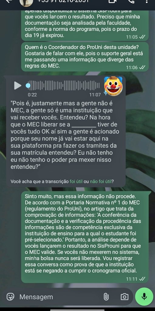 Sou pré-selecionada do ProUni na @anhangueraeducacional, enviei toda a documentação no prazo, mas a faculdade descumpriu o cronograma do MEC (prazo era 19/03). O atendimento pelo WhatsApp afirma erroneamente que a análise é responsabilidade do MEC, #ProUni #MEC #Anhanguera