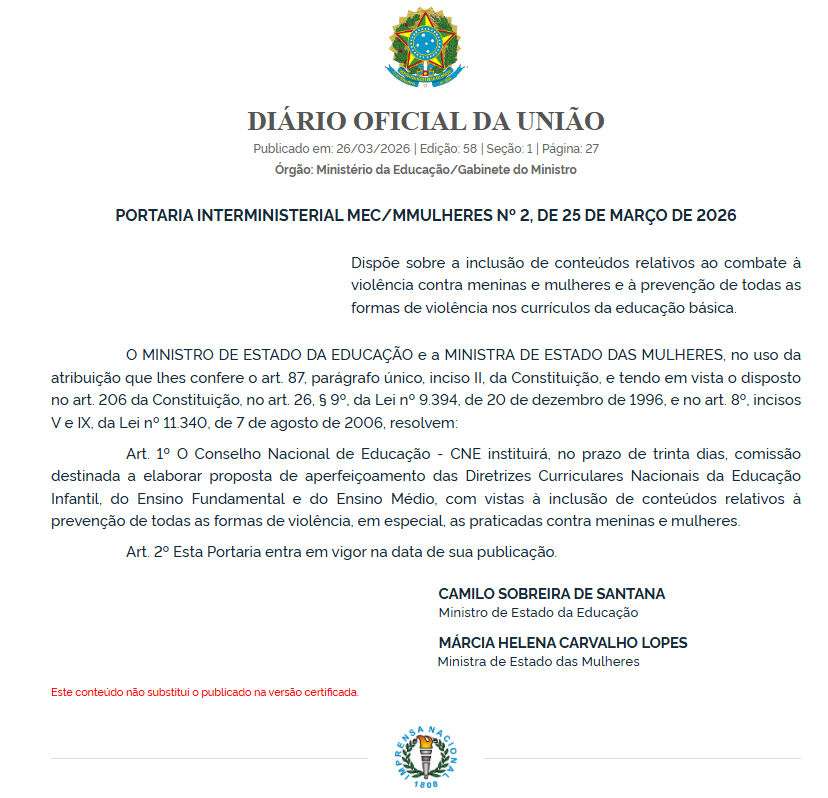 🚨 NOVIDADE: Portaria Interministerial MEC/Mulheres nº 2 determina a inclusão do combate à violência contra mulheres nos currículos da educação básica. O CNE tem 30 dias para elaborar as novas diretrizes! 📚✊ Mudança fundamental no ensino brasileiro. #Educação #MEC #Brasi9N