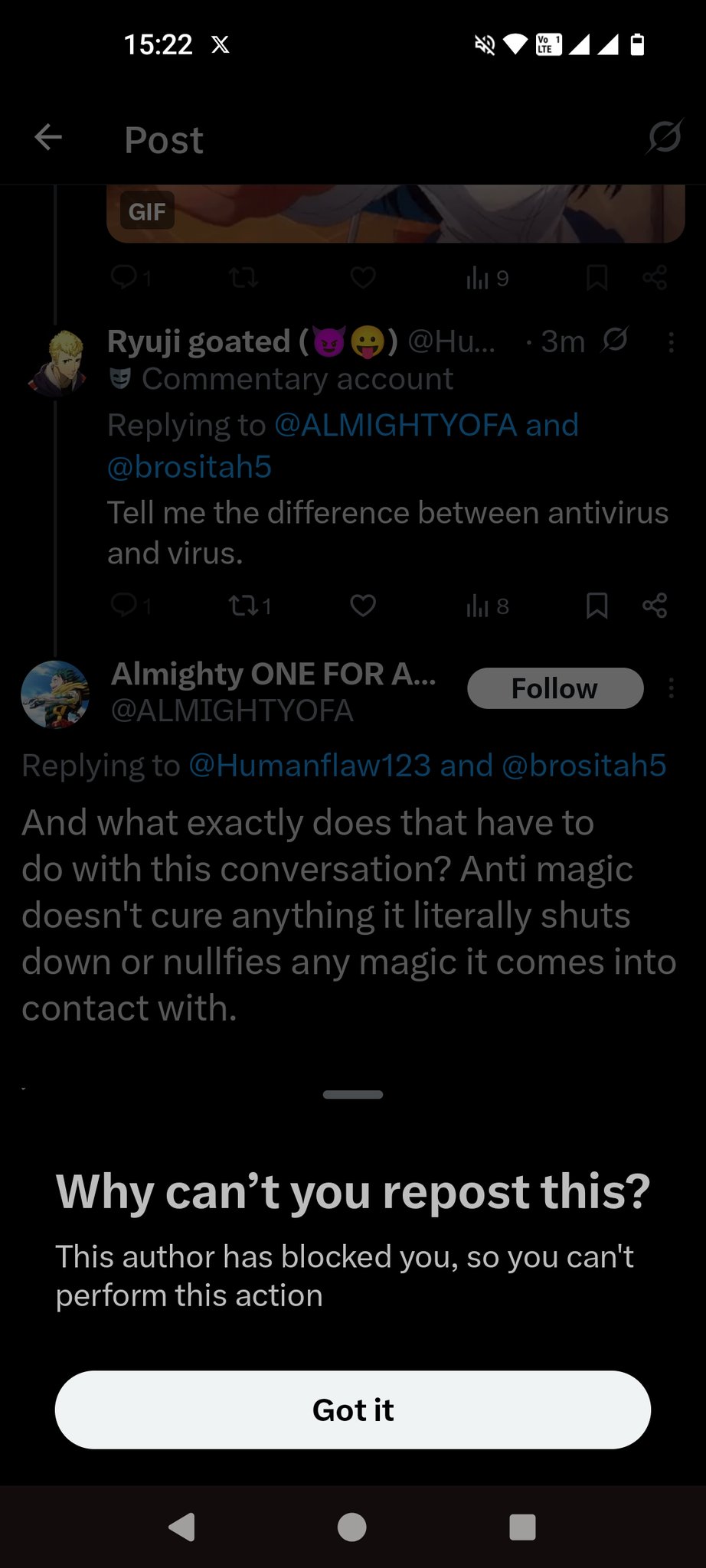 Ryuji goated (😈😛) @Humanflaw123 · 1m Pussy ass MHA fans. I beg you mfs to never talk about black Clover if you haven't consumed it personally. Anti magic does not shut down anything. If anything it's Asta that makes anti magic seems so strong so give the man his flowers. #Mha