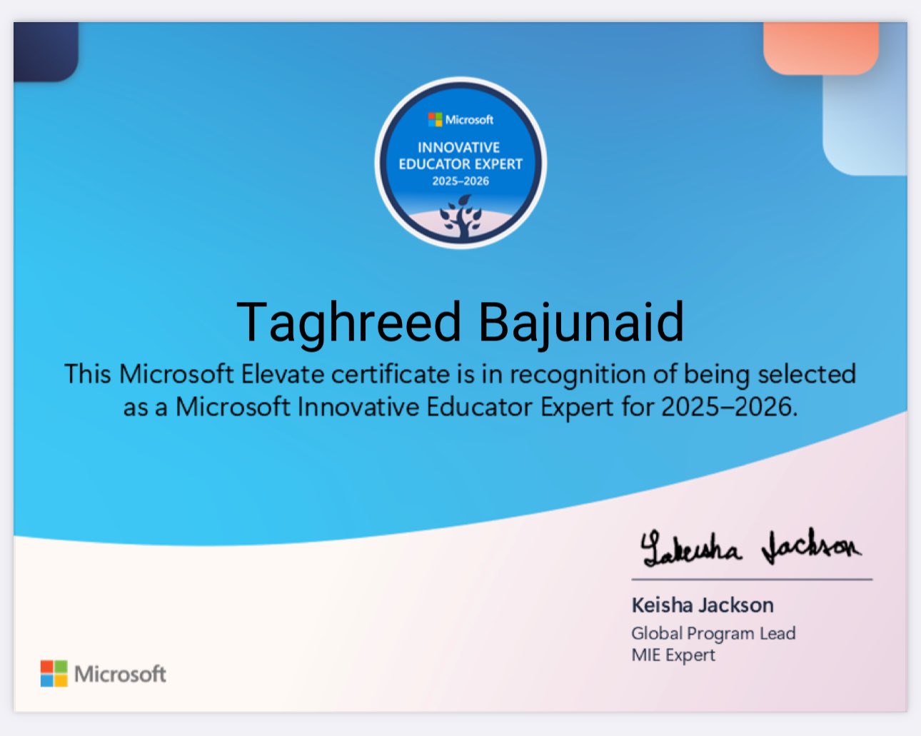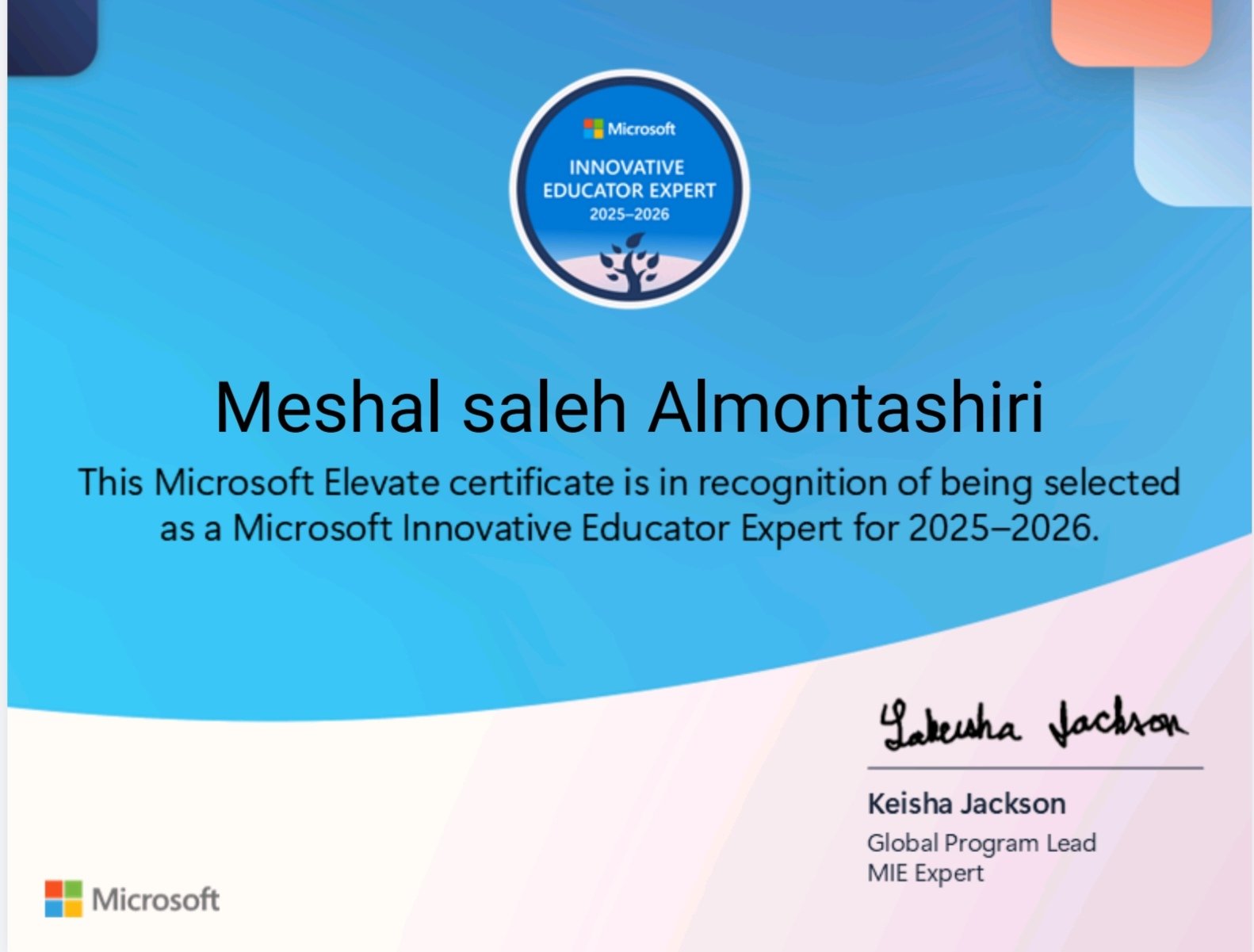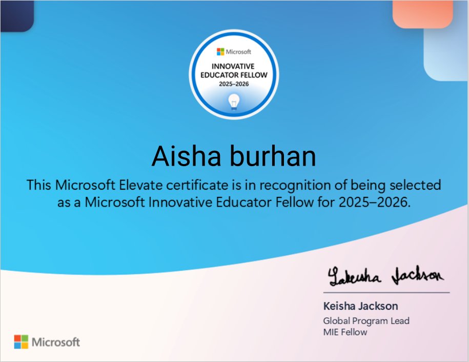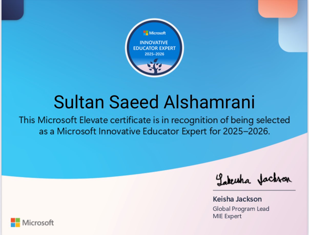 بفضل الله حصلت على شارة #خبير_مايكروسوفت_للتعلم_الابداعي (MIE Export) لعام 2025-2026، هذه الشارة تعزز شغفي بتوظيف التقنية لابتكار تجارب تعلم تفاعلية، وتدفعني لمواصلة تطوير التعليم نحو توظيف أدوات رقمية تواكب احتياجات المتعلمين.