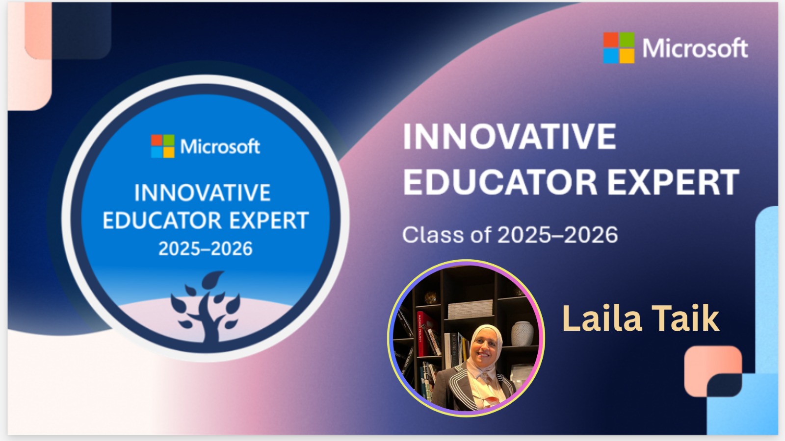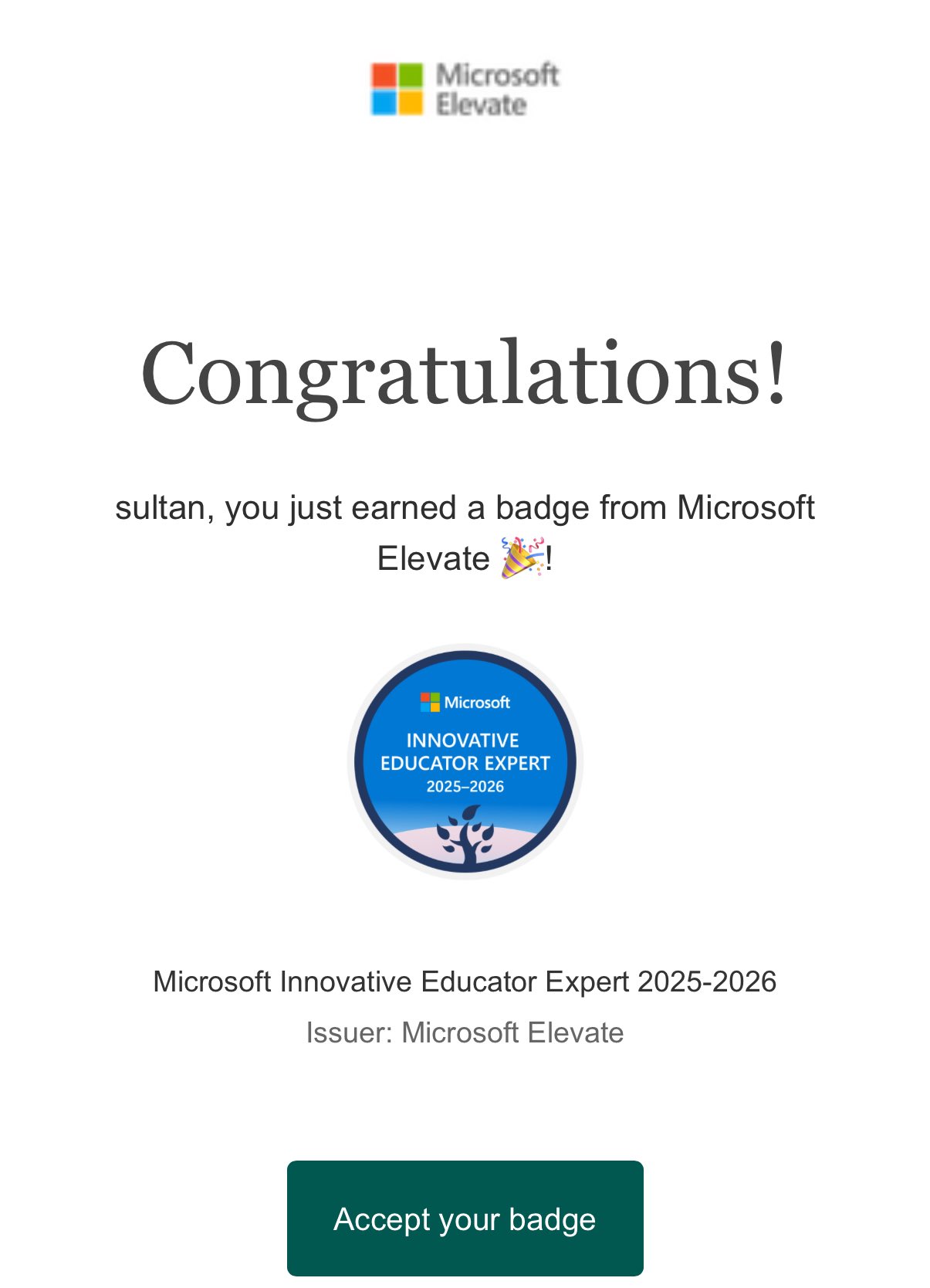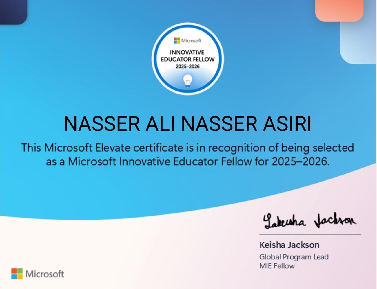 بفضل الله حصلت على شارة #خبير_مايكروسوفت_للتعلم_الابداعي (MIE Export) لعام 2025-2026، هذه الشارة تعزز شغفي بتوظيف التقنية لابتكار تجارب تعلم تفاعلية، وتدفعني لمواصلة تطوير التعليم نحو توظيف أدوات رقمية تواكب احتياجات المتعلمين.