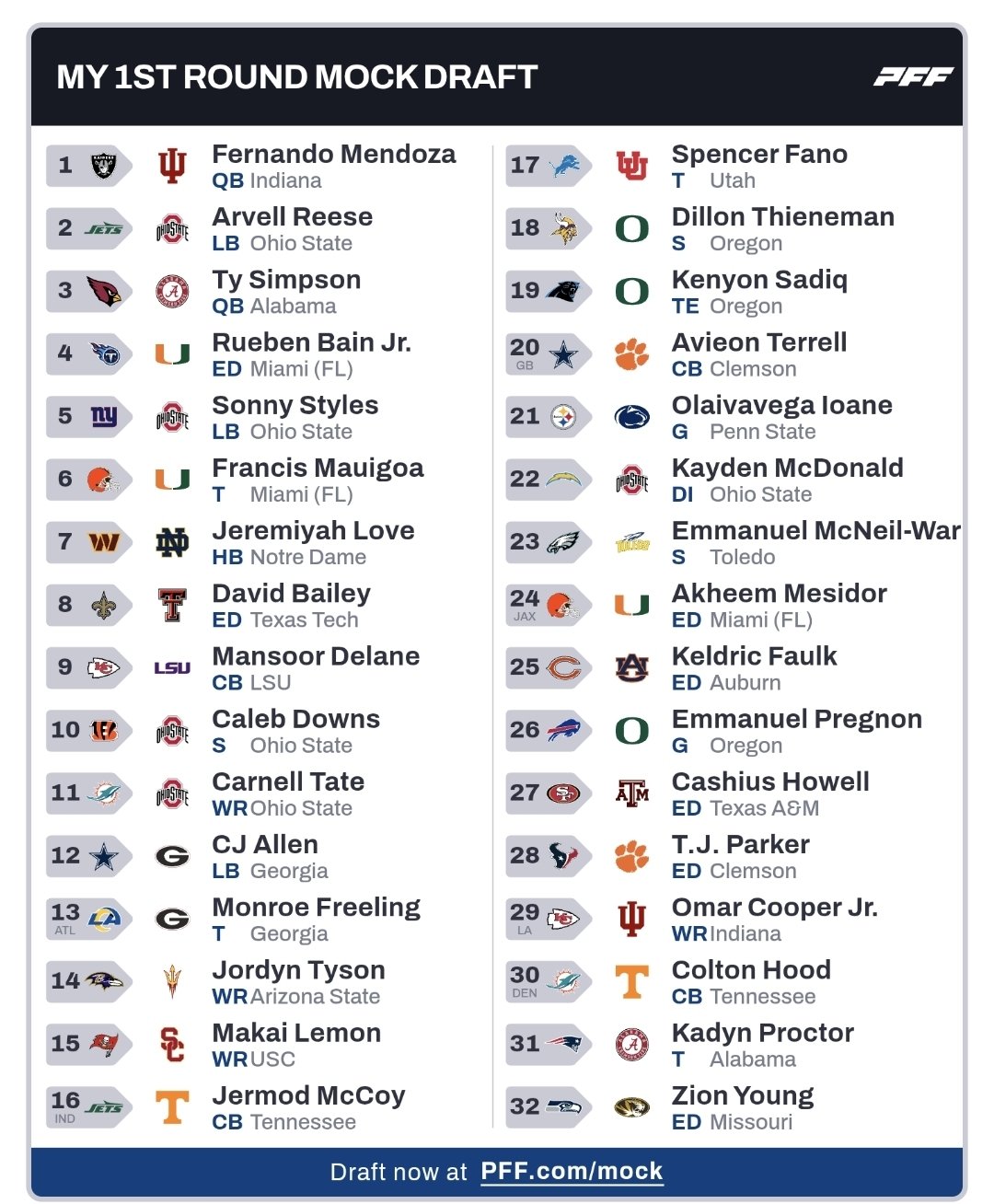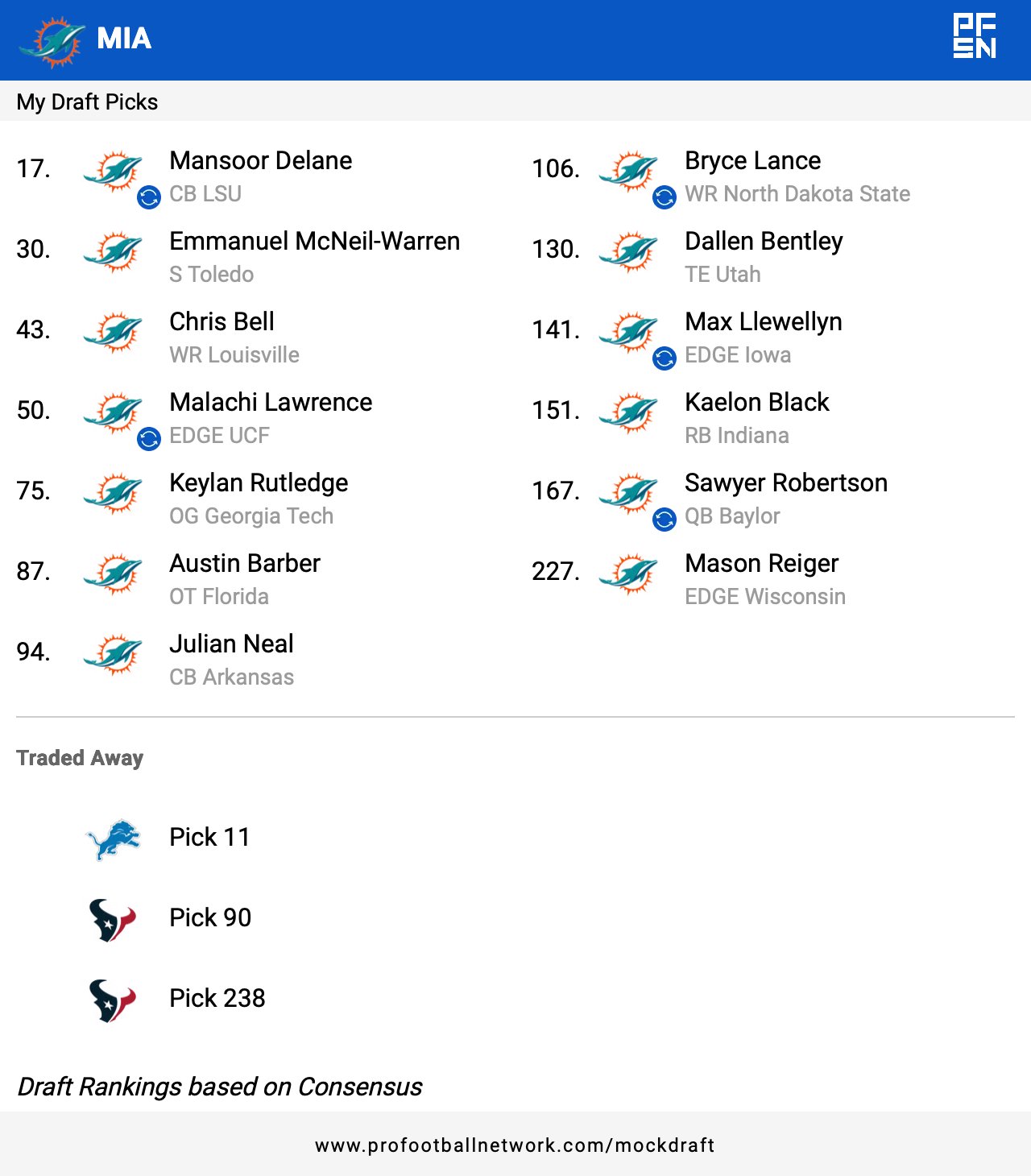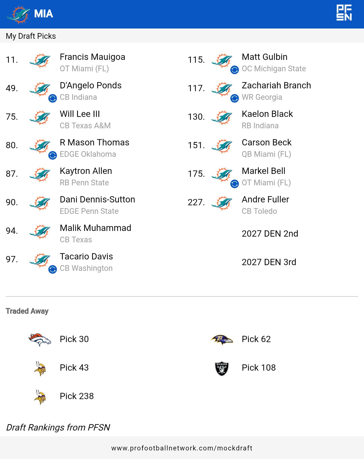 27 Days until the 2026 #NFLDraft ! Can't wait to see what John-Eric Sullivan & Jeff Hafley cook up. If it's anything like my mock today i'll be a day 1 believer! Can't believe i had some of these players fall, but in the Draft, anything is possible! #MiamiDolphins#MockDraft