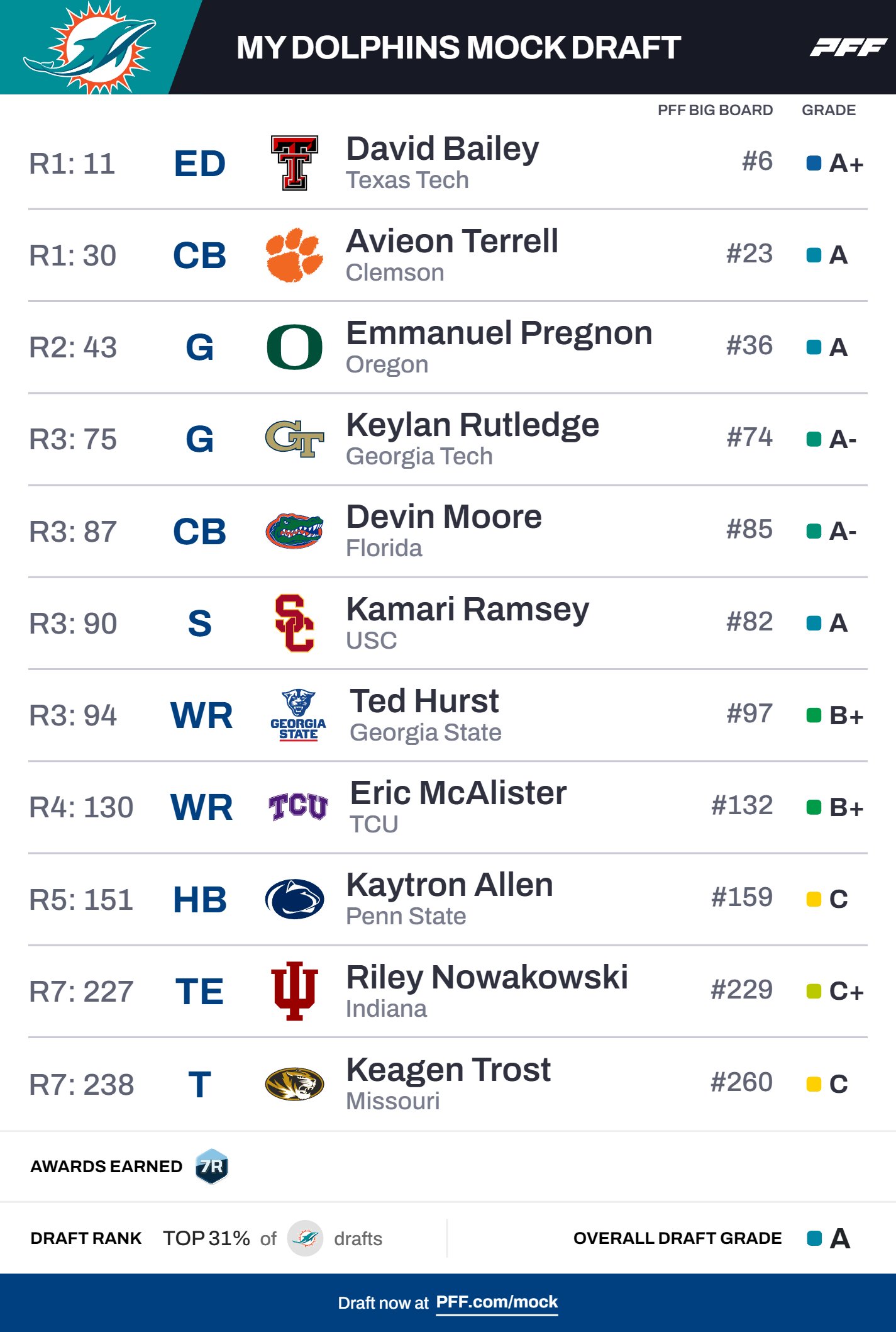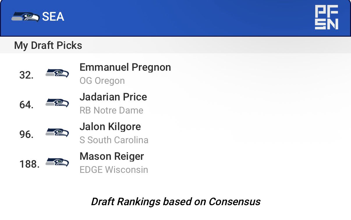No trade #Seahawks#MockDraft. Lots of talk in the Seahawksverse of Pregnon and Price. So, decided to try to take them both in the first two picks to see how it turned out. Kilgore can play both Safety and Outside Corner. Reiger is very underrated and a solid late pick.