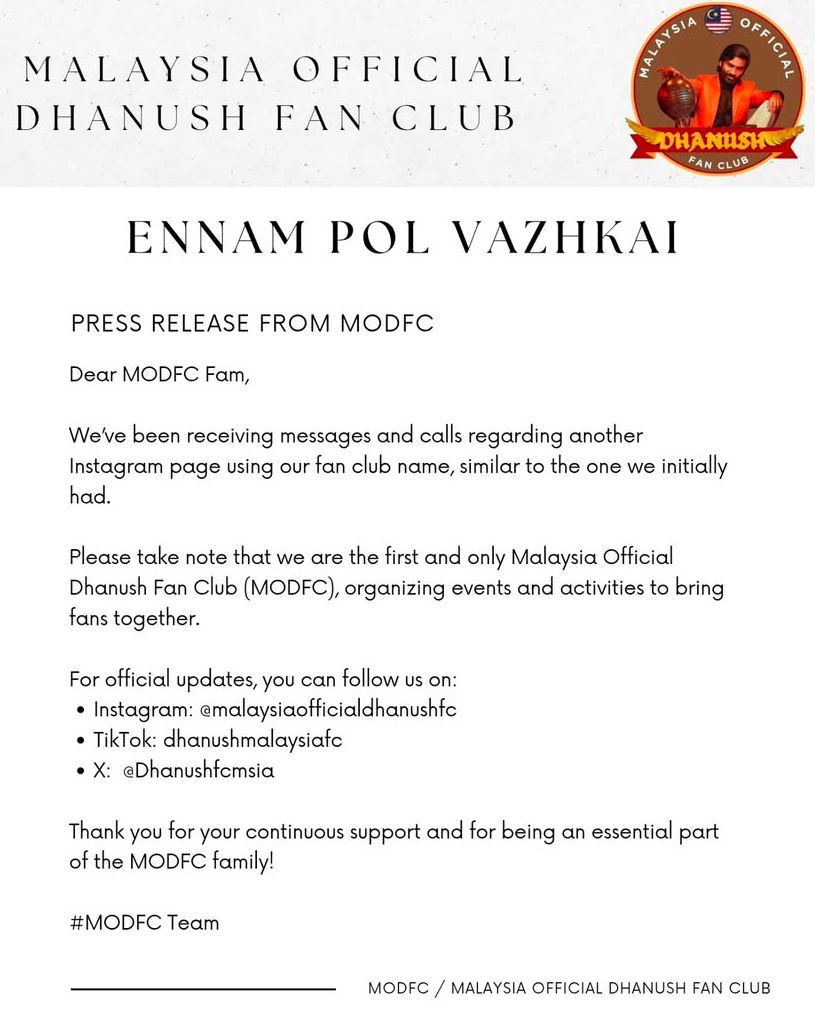 Malaysia Dhanush Fan Club 🇲🇾 @Dhanushfcmsia · Feb 8, 2025 Official Statement from us Malaysia Official Dhanush Fan Club ❤️ #MODFC #Dhanush 53 149 4.1K