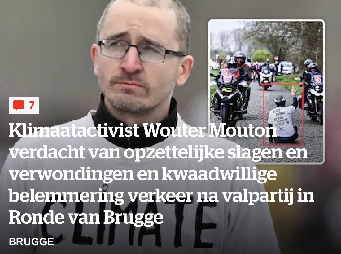 Opzienbarend moment in het slot van de Ronde van Brugge. De beruchte klimaatactivist Wouter Mouton, die eerder al toesloeg in de Ronde van Vlaanderen, Luik-Bastenaken-Luik en de bekerfinale, veroor...