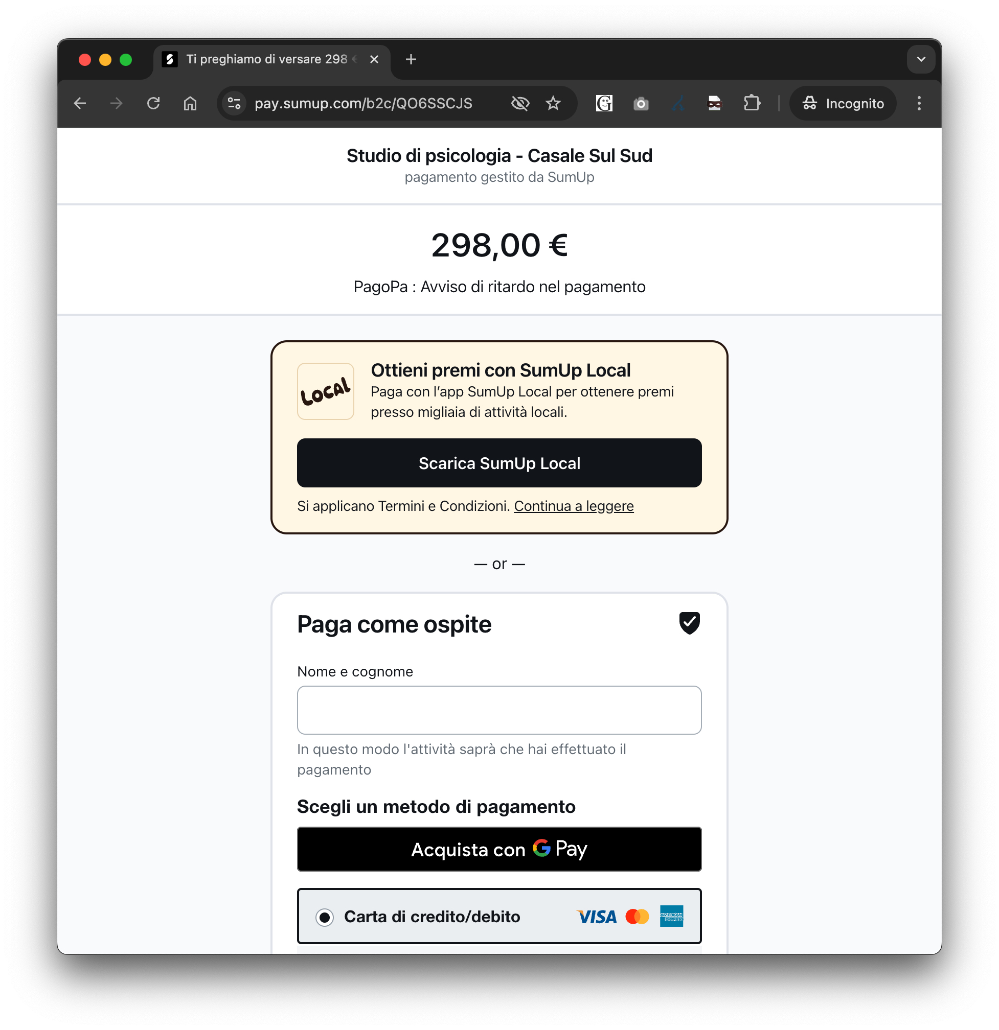 Insidioso questo #phishing della #multa da pagare tramite #pagopa che porta invece a una pagina di pagamento @SumUp intestata tra l'altro a un presunto Studio di Psicologia. I truffatori utilizzano una pagina di ricezione pagamento #SumUP pronta a ricevere i fondi di chi - per evitare lungaggini - decide di pagare direttamente online la multa ed evitare aumenti e decurtazione punti paventati nel messaggio stesso. Come sempre, importante prestare attenzione a tutti, al mittente della mail, al destinatario del pagamento, alla URL che non è quella di Pago PA, al testo del messaggio che presenta incoerenze, oltre al fatto che le multe per violazione del codice della strada non arrivano via posta elettronica.