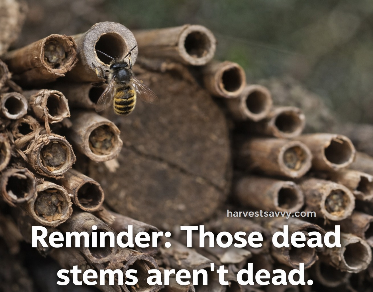 Many native bees overwinter in stems, soil, leaves, and old wood.