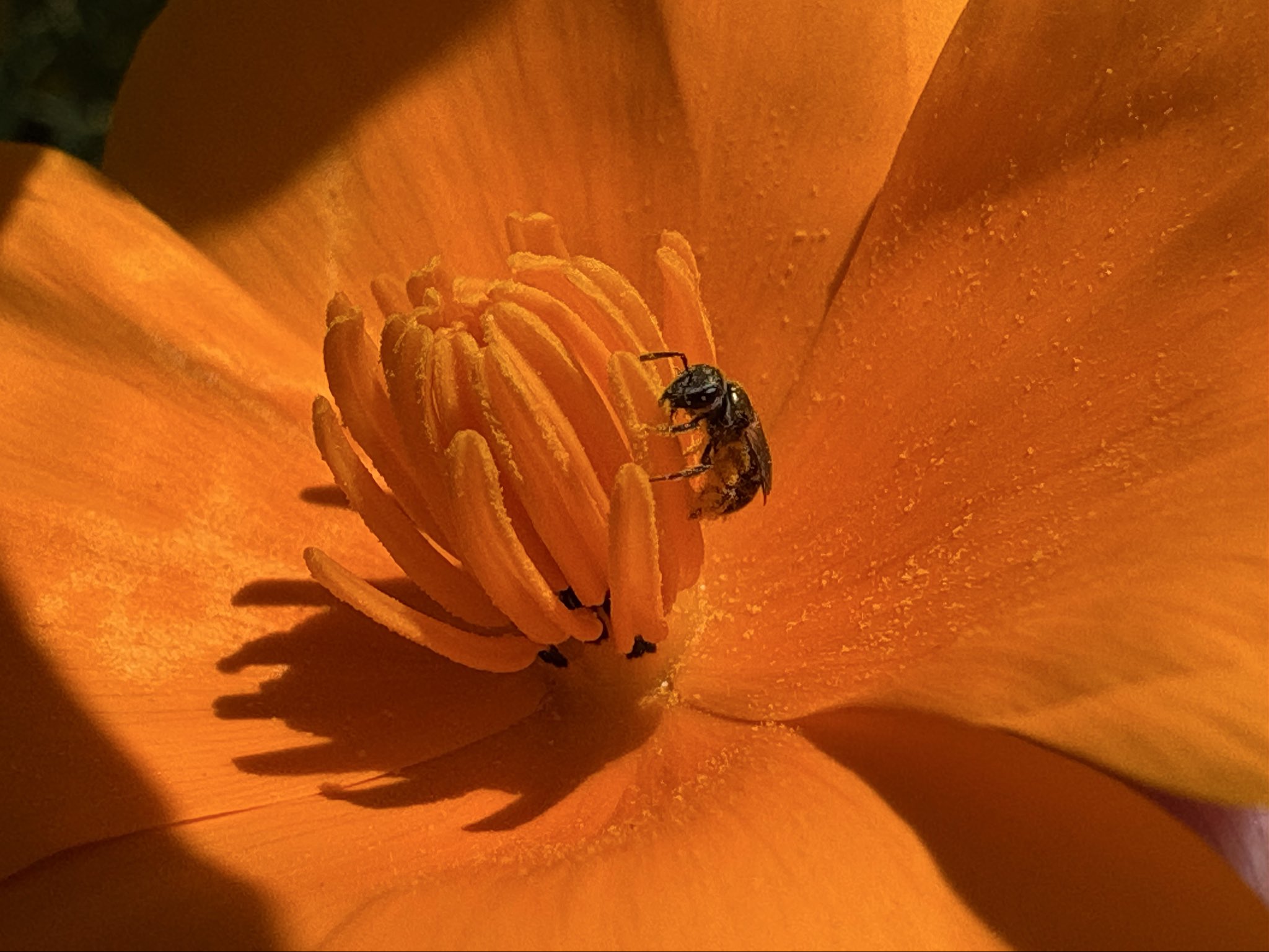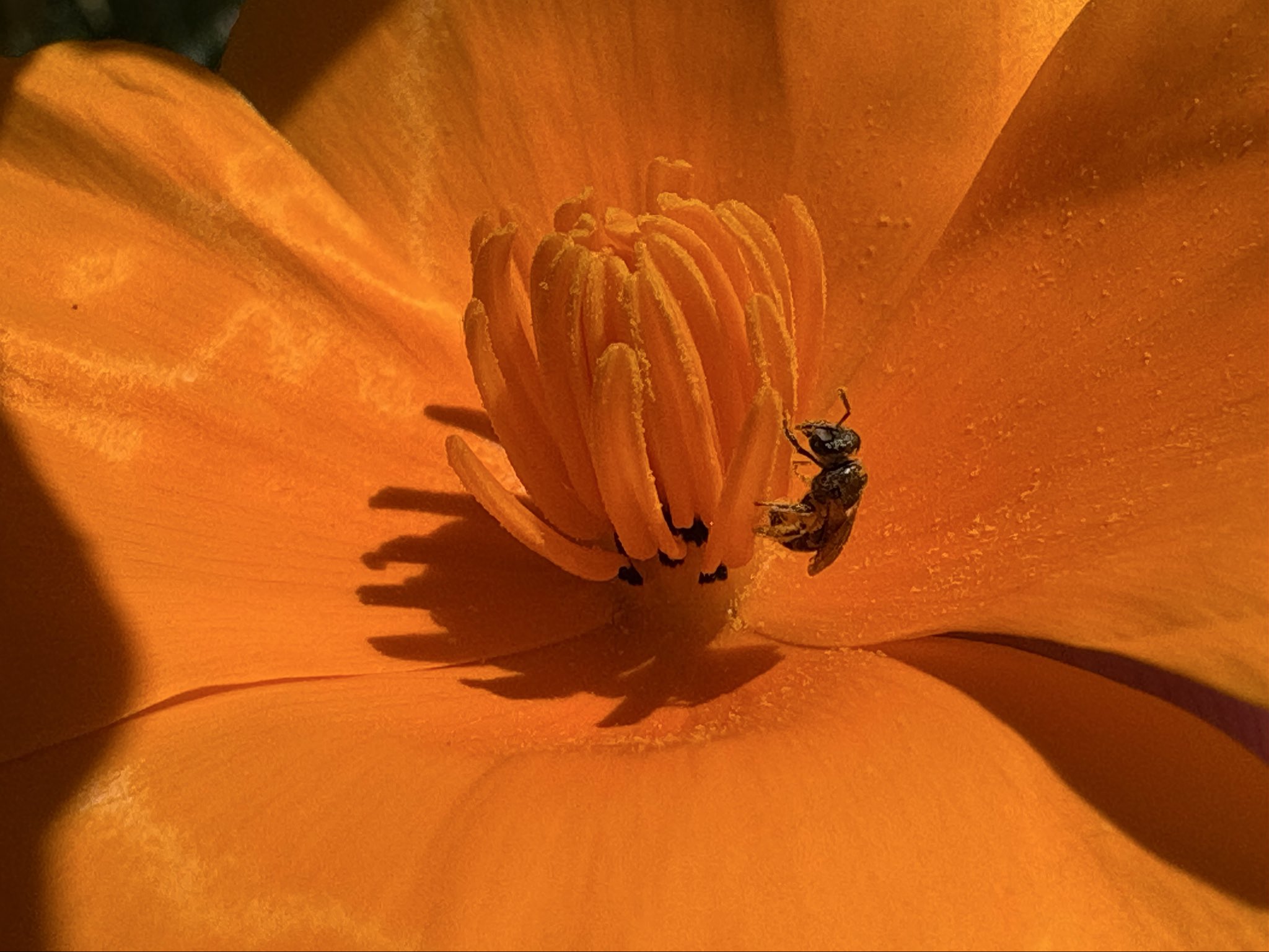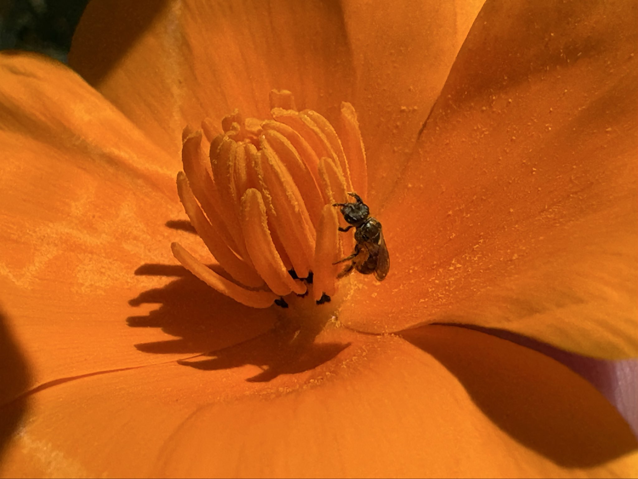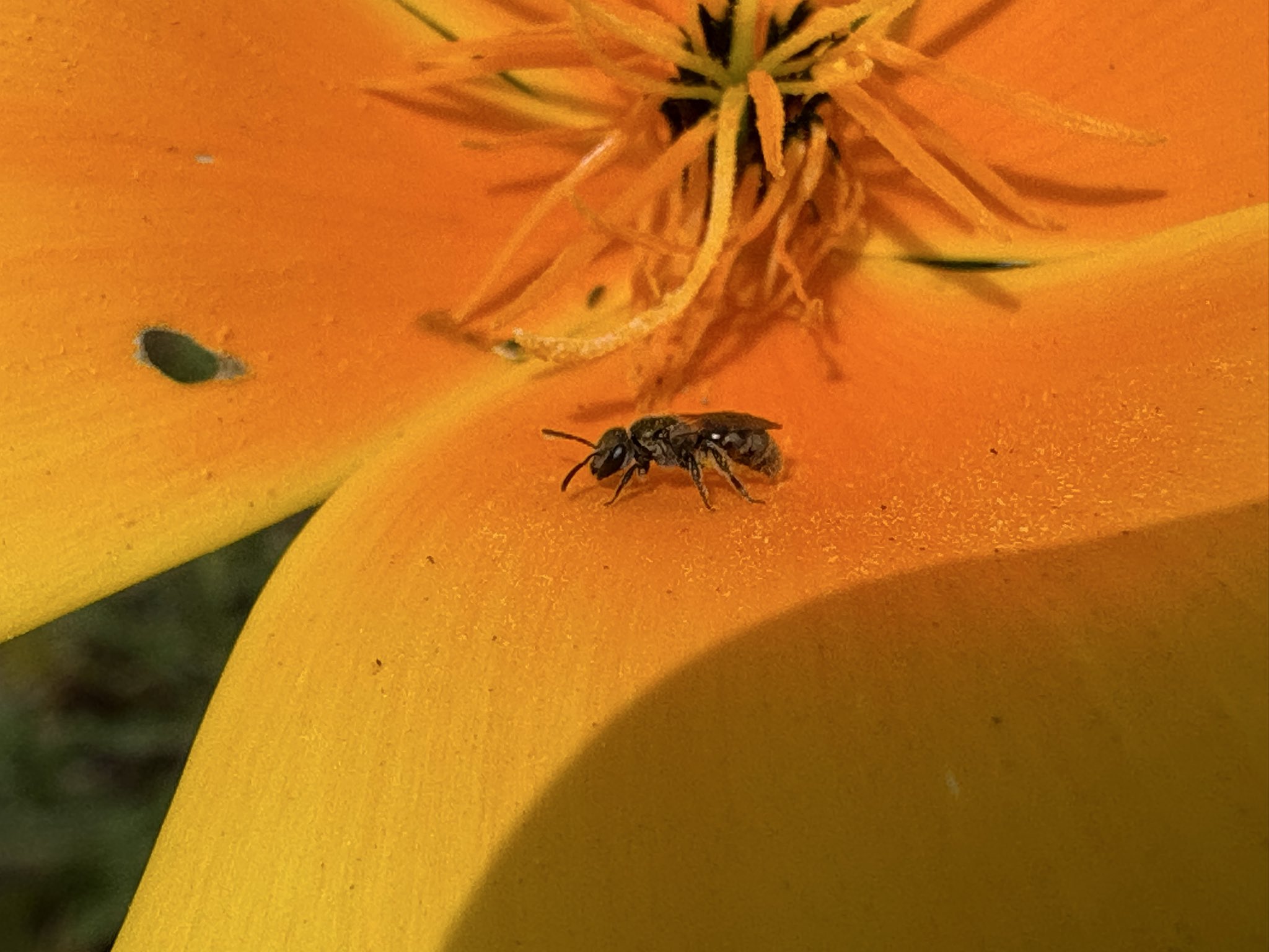 In today’s episode of “When you’re so small California poppy anthers are like tree trunks to you”… this little Dialictus bee. [Alameda, CA 3-20-26] #bees#nativebees