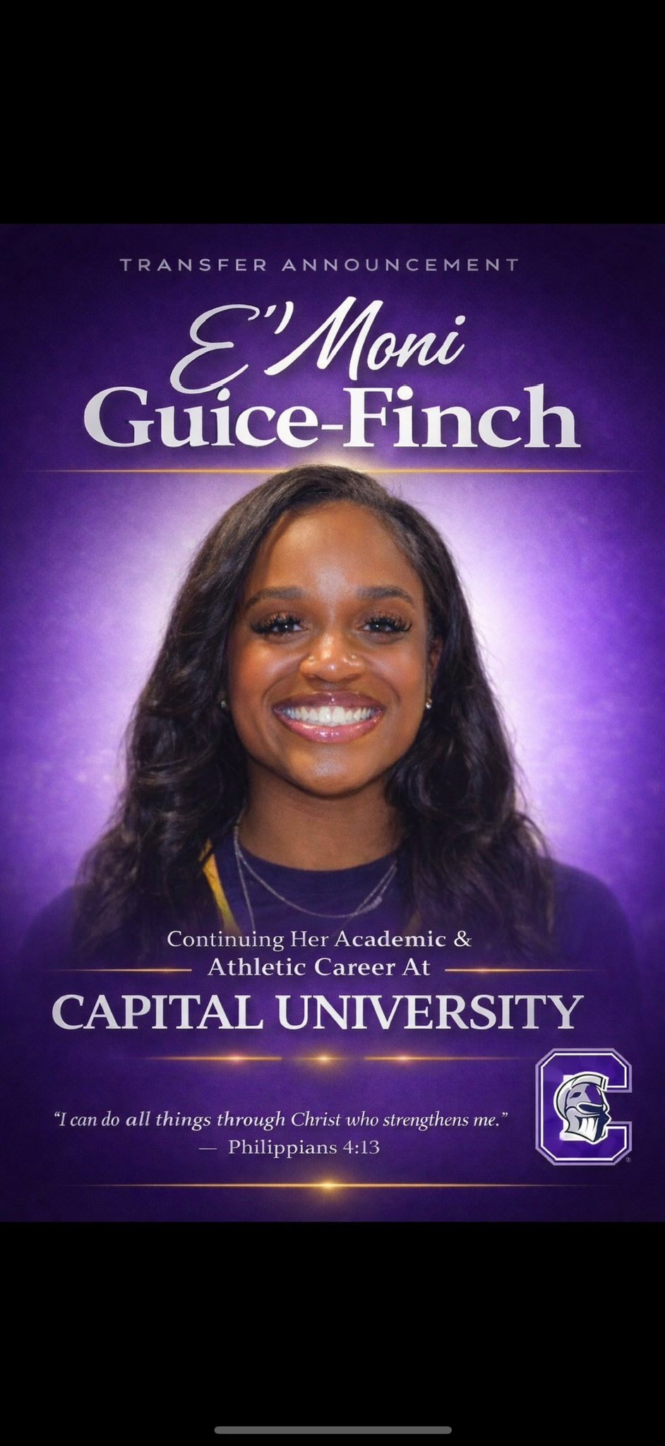I’m blessed to announce that I will be continuing my academic and athletic career at Capital University while completing my senior year, trusting God with everything that’s ahead.