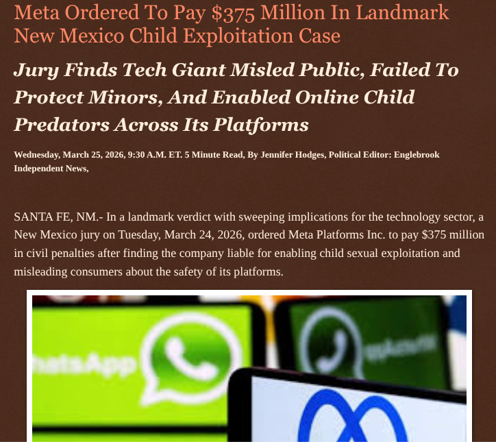 Art Fletcher @ArtFletcher9 · 3d Meta Ordered To Pay $375 Million In Landmark New Mexico Child Exploitation Case englebrookindependentnews.com/2026/03/25/met… via @Englebrooknews #NewMexico @Meta #Trial #ordered #pay #online #child #safety #violations #ChildPredators @wireless_step @HRG_Media @LodiNJNews @Fordmb1953 @SarahGeving1 behappy @janninereid1 @gator4kb18 @MichelleF_35 @TrumpWasRite2 @KathyKbrose @RobGerundo @JimBobW49 1 2 4 57