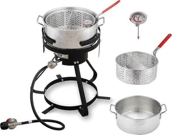 Elevate your outdoor cooking with the Feasto 10 QtAluminum Propane Fish Fryer Pot Kit! Featuring a 50,000 BTU burner, adjustable regulator, and ergonomic design for crispy perfection. Durable, easy to clean, and rust-resistant.