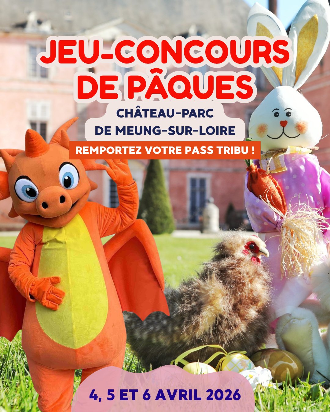 🔵 𝗝𝗘𝗨-𝗖𝗢𝗡𝗖𝗢𝗨𝗥𝗦 🎉🐣 | Sur Facebook et Instagram, tentez de gagner 1 pass tribu (2 adultes et 3 enfants) valable pour #Paques au château-parc de Meung-sur-Loire les 4, 5 et 6 avril 2026 ! ✨