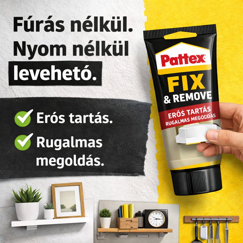 A PATTEX Fix & Remove erősen tart, mégis nyom nélkül eltávolítható – akár 6 kg rögzítésére is alkalmas.
