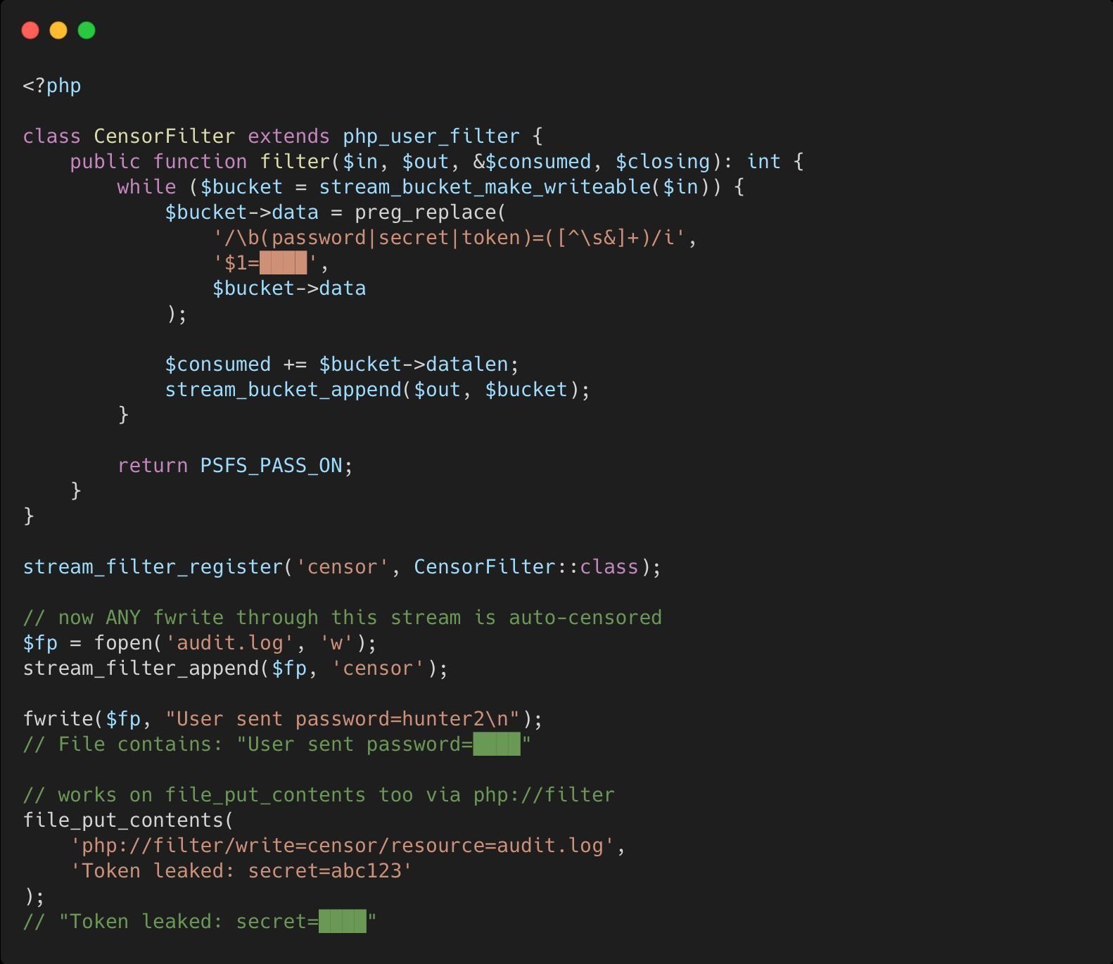 You can build encryption, compression, sanitization layers that plug into ANY fopen/fread/fwrite call.