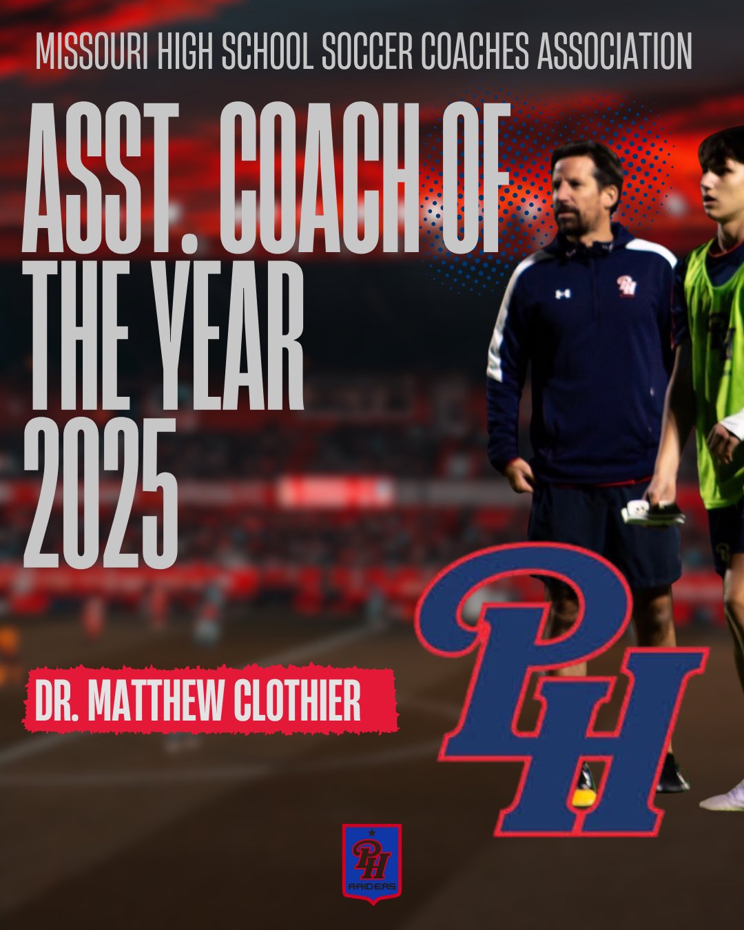 Huge congratulations to Coach Clothier on being selected as the Missouri High School Coaches Association Asst. Coach the Year! Well deserved Coach!! #tng#PhRaiderNation