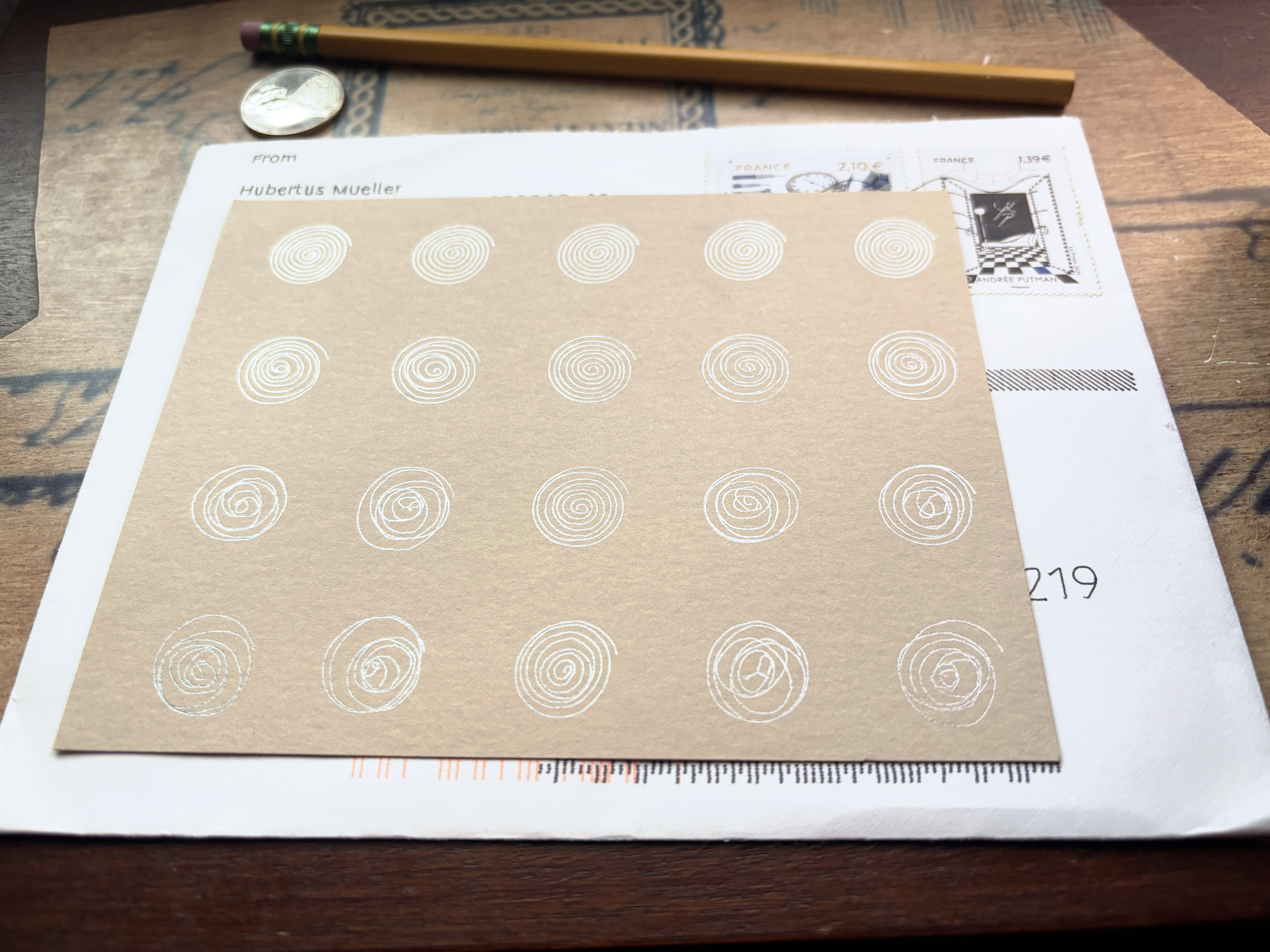 Just received: "Tracing the Line" by Hubertus Mueller. struggling here to find a low-angle to would capture the shimmer/sheen of the silver metallic ink against the cardstock, wasn't entirely successful (it's very subtle viewed straight-on flat-lit). 🥰�