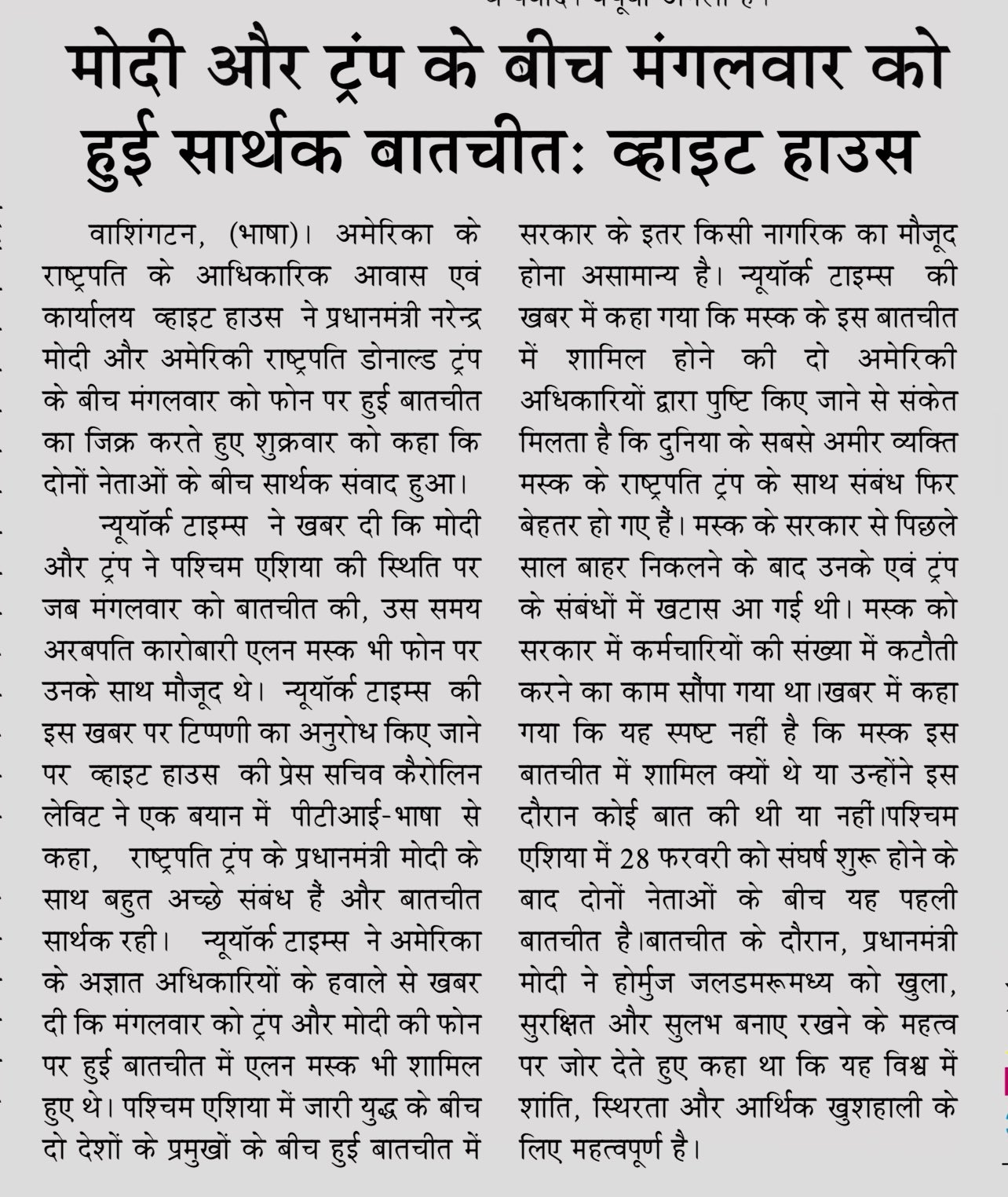 India News: NEW DELHI: The ministry of external affairs (MEA) on Saturday stated the recent phone call over Iran war was only between Prime Minister Narendra Modi.