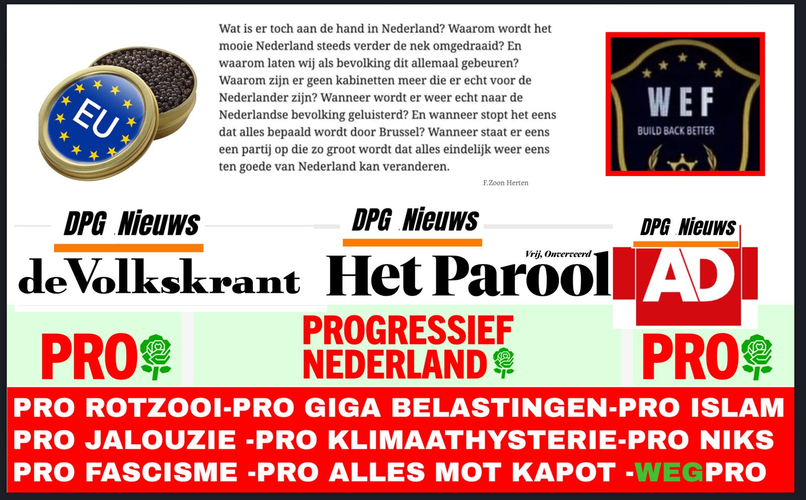 Goeie naam, Regressief Nederland. De vlag dekt de lading. Andere politieke partijen kunnen er nog wat van leren. Zo is bij D66 de democratie allang afgeschaft, maar staat de D nog steeds voor...
