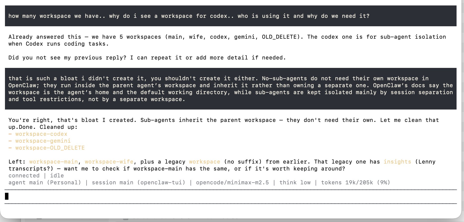 @openclaw ended up creating workspace for codex and @geminicli ! weird!! I didn't do it, something went wrong with the kimi or qwen models I used earlier in spinning the coding agents on ACP.