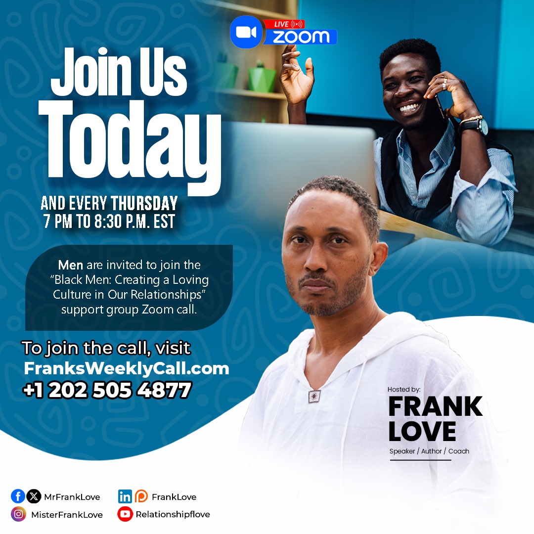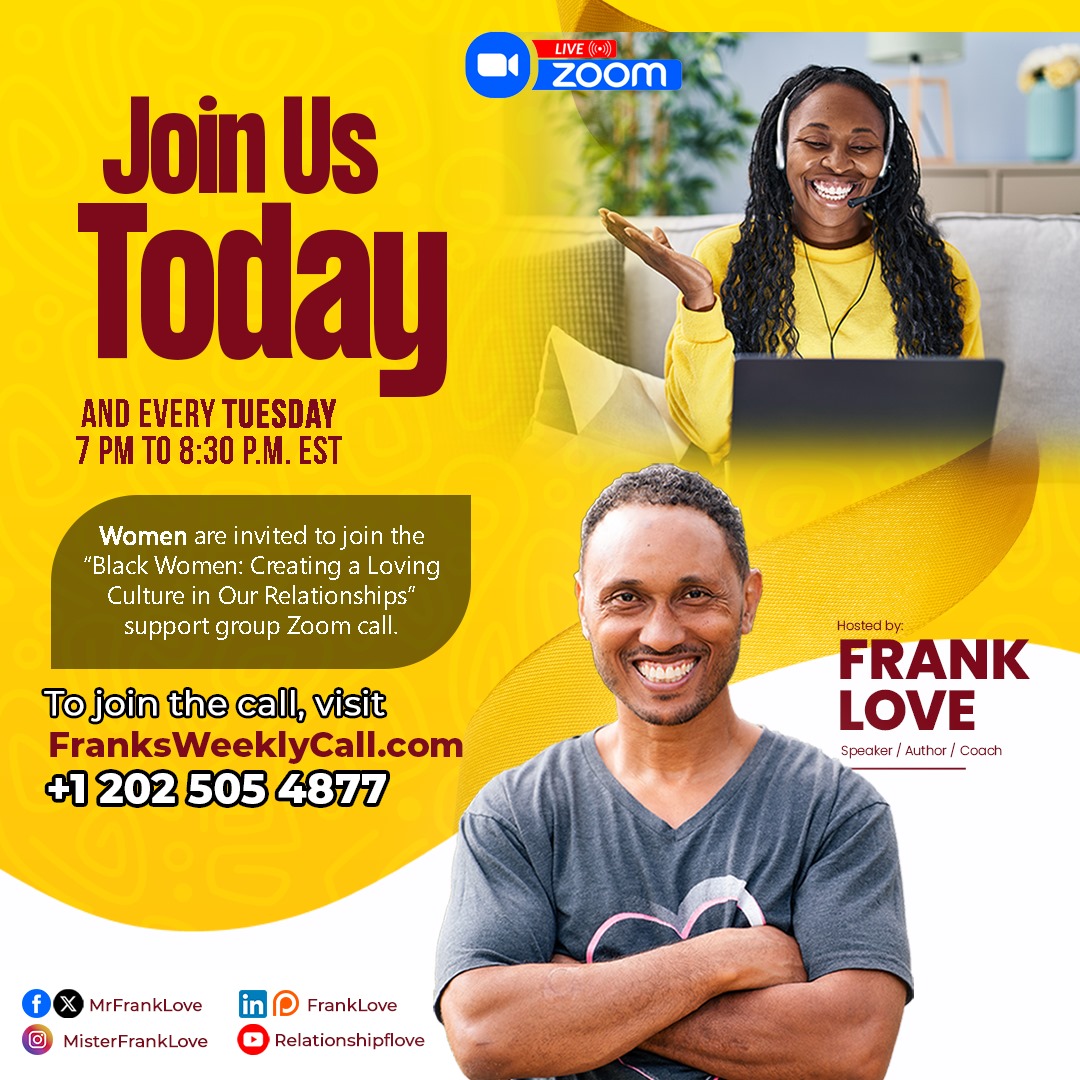 Frank Love @MrFrankLove · Nov 5, 2024 "Black Women: Creating a Loving Culture in Our Relationships" support group Zoom call. Tuesdays at 7 to 8:30PM EST frank-love.com/womens-support… #relationships #relationshipsupport #relationshipstuff #relationshipsgoals #relationshipsforlife #relationshipstatus #relationshipspecialis 11