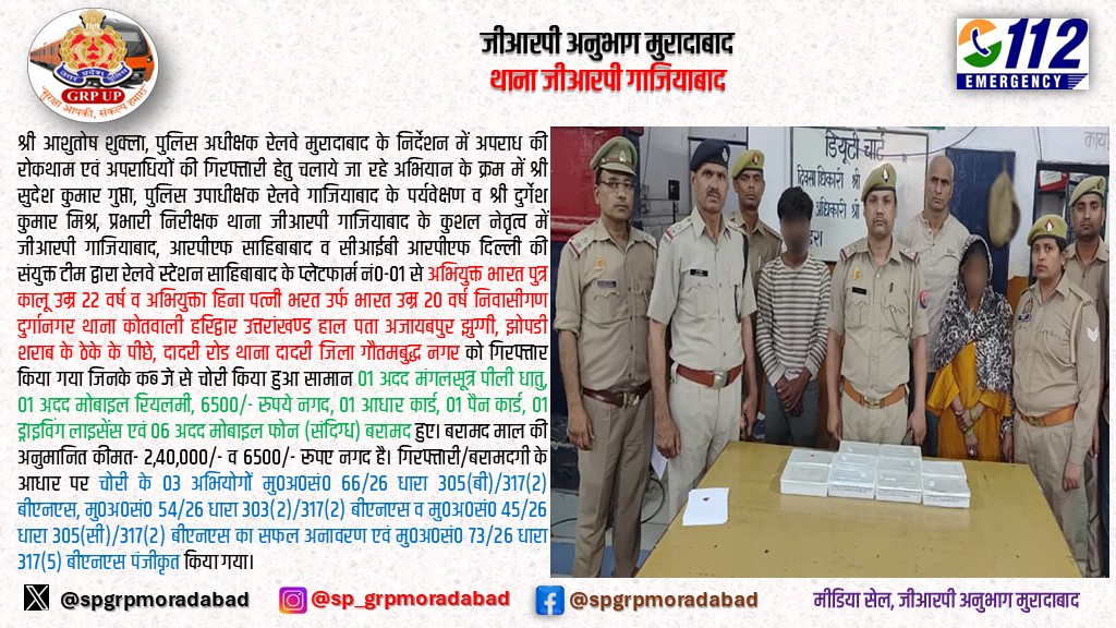 #GRP_गाजियाबाद व #RPF द्वारा 01 अभियुक्त व 01 अभियुक्ता को गिरफ्तार किया गया, जिनके कब्जे से चोरी किया गया 01 मंगलसूत्र पीली धातु, 01 मोबाइल फोन व ₹6500/- नगद एवं 06 मोबाइल फोन (संदिग्ध) बरामद कर चोरी के 03 अभियोगों का सफल अनावरण एवं 01 अभियोग पंजीकृत किया गया।