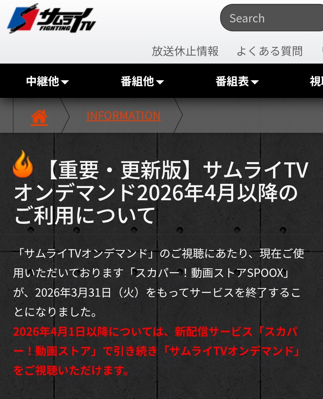 KAKUTOLOG📶プロレス/ボクシング/MMA/格闘技カクトウログ @kakutolog · 7h サムライTVオンデマンド2026年4月以降のご利用について �samurai-tv.com/news/260317/e 📝引き続きWeb視聴もできるのでよかった〜。「SPOOX」が03/31で終了するが、サムライ分については後継の「スカパー!動画ストア」で視聴できる。詳細はリンク先を。 #samuraitbI 1 2 876