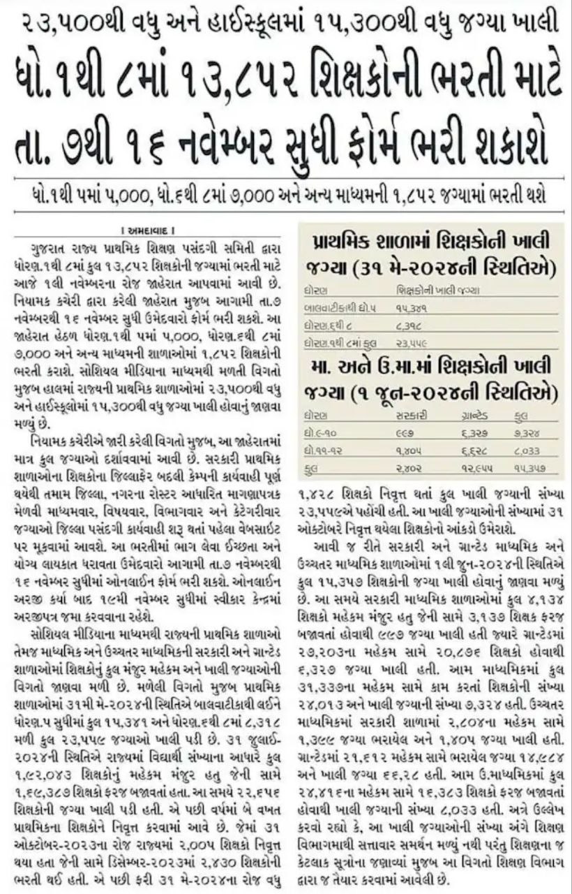 સરકારી અને ગ્રાન્ટેડ માધ્યમિક અને ઉચ્ચતર માધ્યમિક વિભાગમાં 1 જૂન 2024 ની સ્થિતિ પ્રમાણે 15000+શિક્ષણ સહાયકની જગ્યા ખાલી છે.