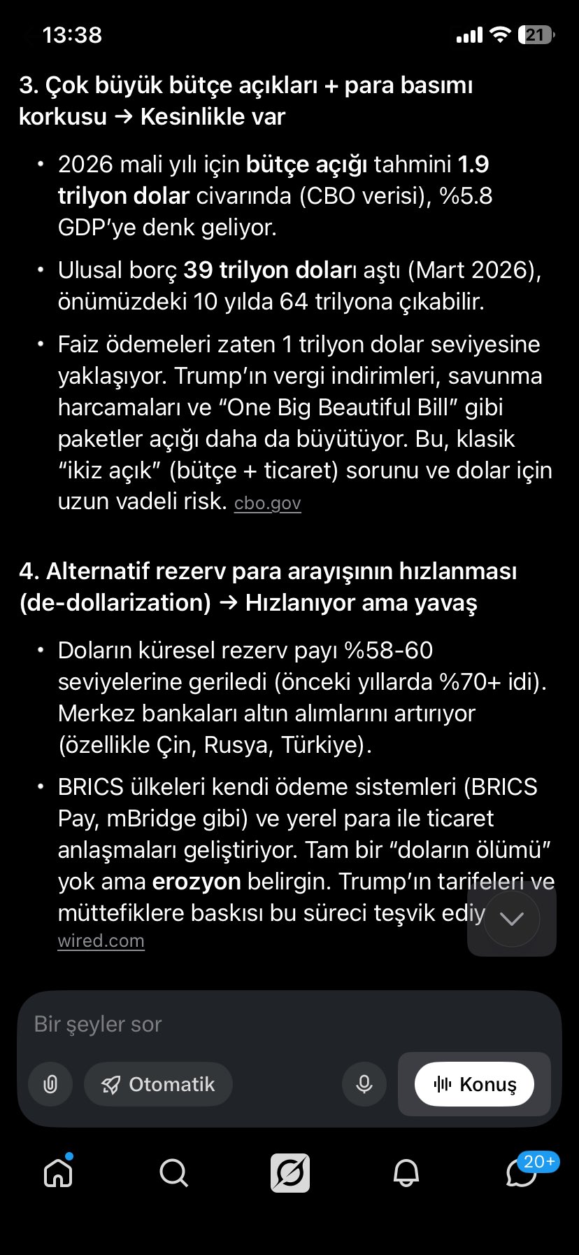 Üçüncü madde çok büyük bütçe açıkları ve para basımı korkusu ki bu konuda ikinci maddeyle bağlantılı. 39 trilyon borca zıt olarak tüm raporlar faiz indirmeye uygunken çoktan faiz indirmesi gerekirdi ama bağımsızlığa müdahale ve petrol şoku vb enflasyon tutumlarıyla indirmedi. Yani bir para basım korkusu mevcut.