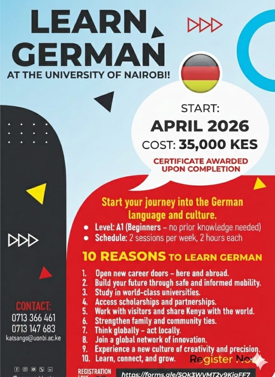 Faculty of Education @uoneducation · 2d Learn German at the University of Nairobi starting this April! Level: A1 (Beginners) Certificate awarded upon completion. Don't wait—open new global doors today! Register here: forms.gle/QfWG5ujToBW7FZ… #learngerman #GlobalOpportunities #studygerman #nairobi @uonbi 1 1 50