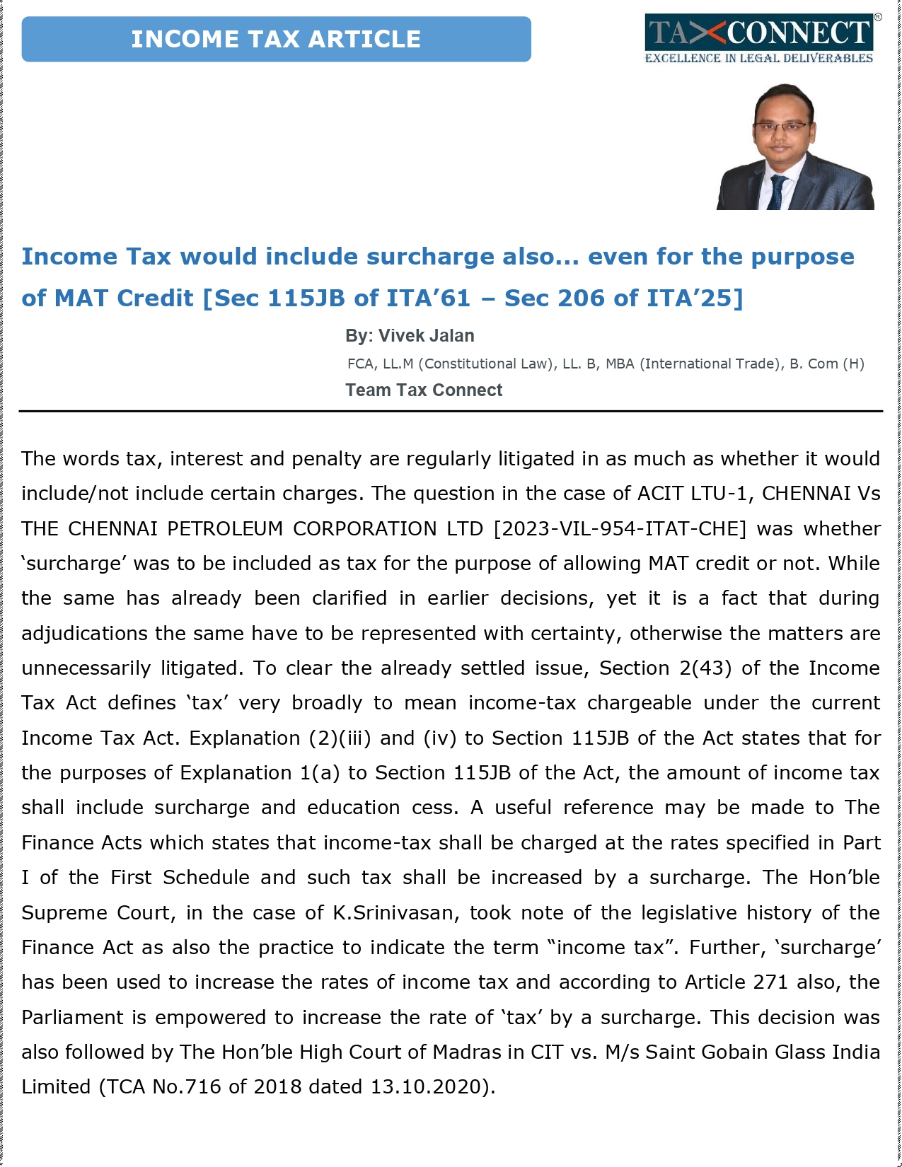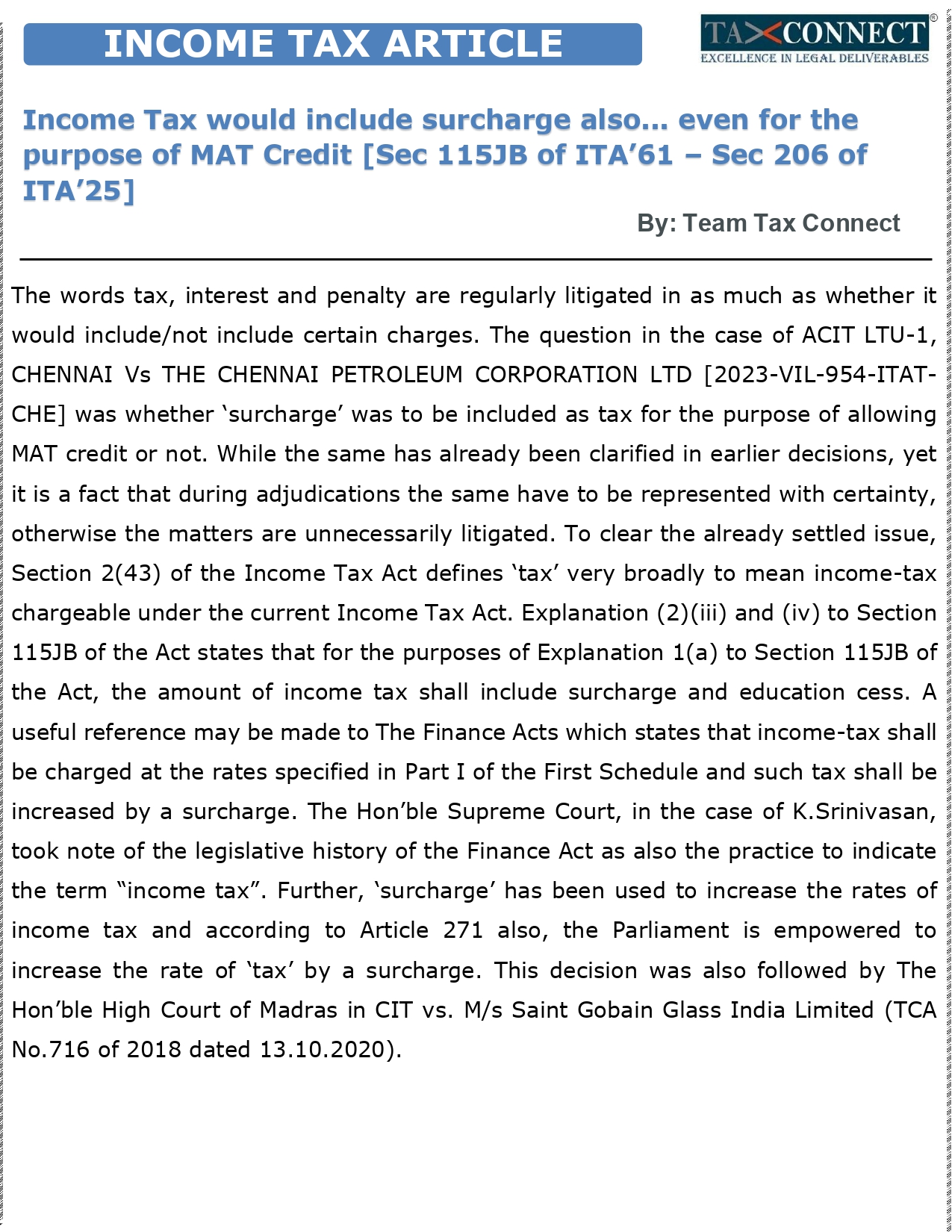 Pleased to share an Article on “Income Tax would include surcharge also... even for the purpose of MAT Credit [Sec 115JB of ITA’61 – Sec 206 of ITA’25]”