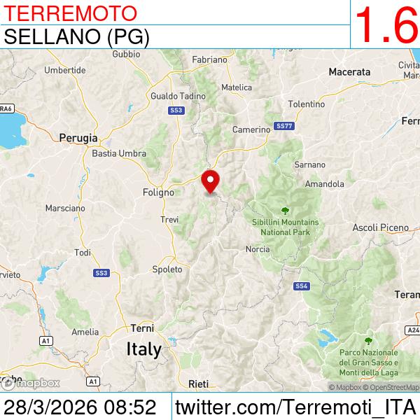 Terremoti in Italia @Terremoti_ITA · 1h Lieve #terremoto alle 08:52 Epicentro: Sellano (PG) Magnitudo: 1.6 Profondità: 11.2 km Dettagli: terremoti.ingv.it/event/45447792 Aiuta questo progetto 💚🤍❤️patreon.com/TerremotiinIta…s2o 24