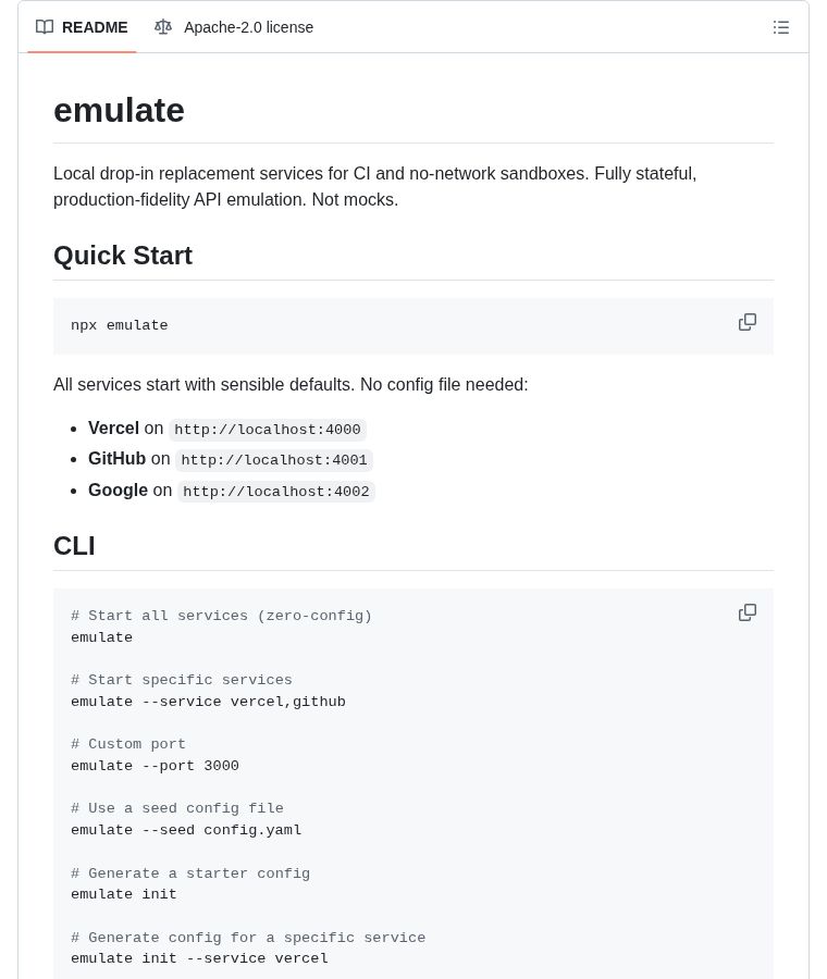 Vercel's emulate: local drop-in replacement for GitHub, Vercel, Google APIs. Stateful, production-fidelity emulation. Zero-config, works in CI and sandboxed environments.