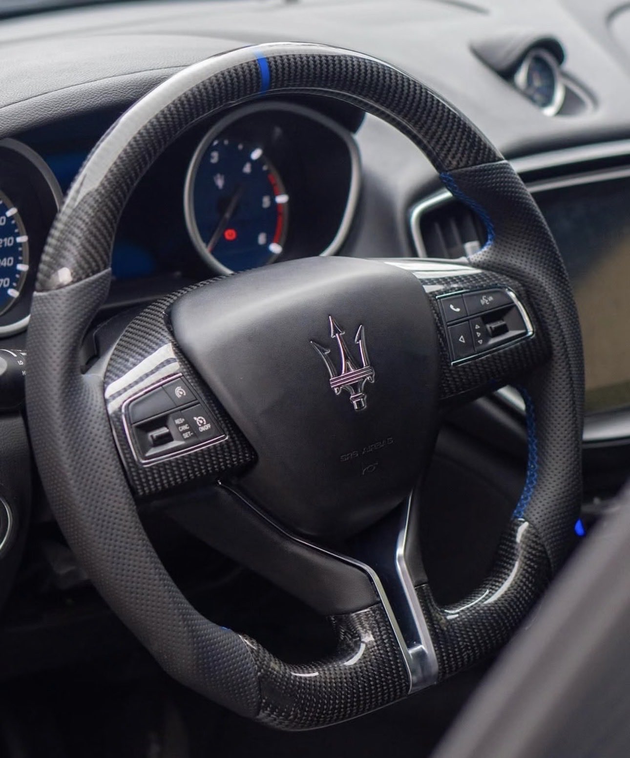 Emily Guo @TTDCraft_Emily · 3d Maserati Ghibli carbon fiber steering wheel: blue stitching, trident logo, and pure luxury in your hands. #ttdcraft #ttdcraftus #ttdcraftshop #Maserati #Ghibli #CarbonFiber @MaSerafini @TheGhibliFamily @MaseratiGh36455 @maseratighibli 5