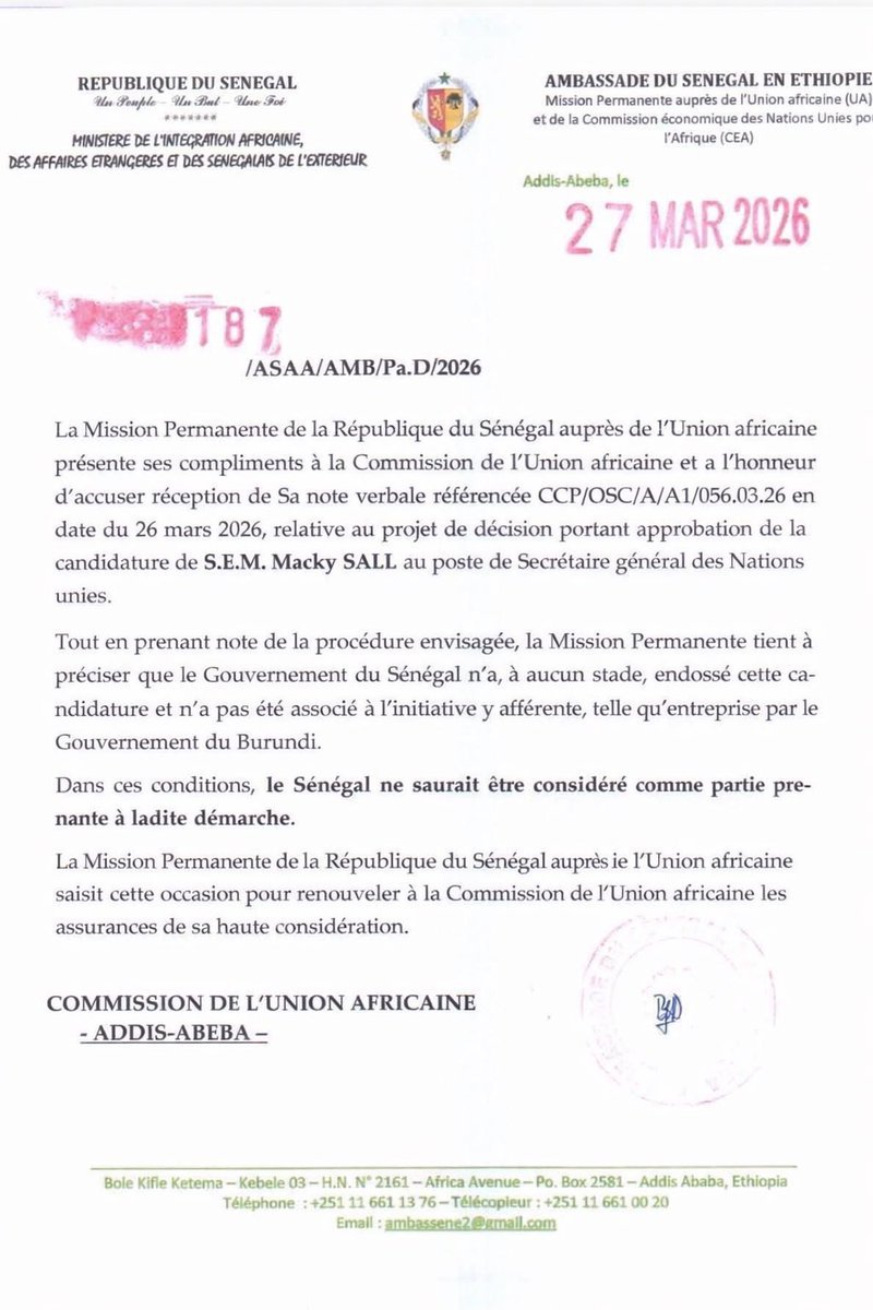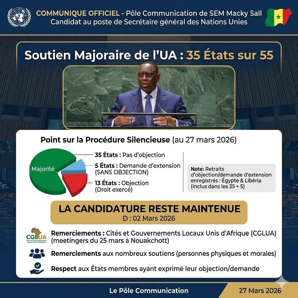 #ONU #UA Succession de Guterres : Macky Sall maintient sa candidature. Je partage avec vous ceci 👇👇👇 "Communiqué du Pôle Communication de SEM le Président Macky Sall, candidat au poste de Secrétaire général des Nations Unies 27 mars 2026 À la suite de la publication a Commission de l’Union Africaine en date du 27 Mars 2026, annonçant que le projet de Décision soumis par Bureau de la Conférence des Chefs d’Etat et de Gouvernement de l’Union Africaine sur le soutien à la candidature du Président Macky Sall au poste de Secrétaire général des Nations Unies n’a pas été adopté en raison de la rupture de la procédure silencieuse par 20 Etats membres, le Pôle communication du candidat Macky Sall tient à préciser ce qui suit : L’Union Africaine compte 55 Etats membres. Sur les 20 Etats membres qui ont interrompu la procédure silencieuse, 14 ont émis une objection et 6 ont sollicité une extension du délai de procédure silencieuse, sans objection au projet de Décision. Il en résulte que trente-cinq Etats membres sur les 55 que compte l’Union Africaine n’ont pas émis d’objection sur l’adoption du projet de Décision, ni demandé une extension du délai de la procédure silencieuse. Le Pôle communication informe que depuis la publication de la Note verbale précitée, la République Arabe d’Egypte, qui faisait partie des Etats membres ayant demandé une extension du délai de la procédure silencieuse, a retiré sa demande ; et que le Libéria, qui faisait partie des pays ayant formulé une objection sur le projet de Décision, a retiré son objection. En conséquence, 13 pays ont donc maintenu leurs objections et 5 leurs demandes d’extension du délai de la procédure silencieuse. Le Pôle communication informe que la candidature du Président Sall, déposée et enregistrée régulièrement le 02 Mars 2026, reste maintenue. Au nom du candidat, le Pôle communication remercie vivement le Bureau de la Conférence des Chefs d’Etat et de Gouvernement de l’Union Africaine et les États membres qui ont soutenu la Décision précitée. Il exprime son respect aux Etats membres qui ont exercé leur droit d’objection et de demande d’extension du délai de la procédure silencieuse. Enfin, le Pôle communication remercie chaleureusement l’Organisation Les Cités et Gouvernements Locaux Unis d’Afrique (CGLUA), pour son soutien au candidat Macky Sall à l’issue de sa réunion du 25 mars 2026 à Nouakchott, ainsi que les nombreuses personnes physiques et morales qui lui ont exprimé leur soutien et leur sympathie." No comment. Lire également, en fichier joint, la note verbale de la Commission de l'Union africaine. Je rappelle cependant que JE SOUTIENS RÉSOLUMENT la candidature du président Sall. #mik